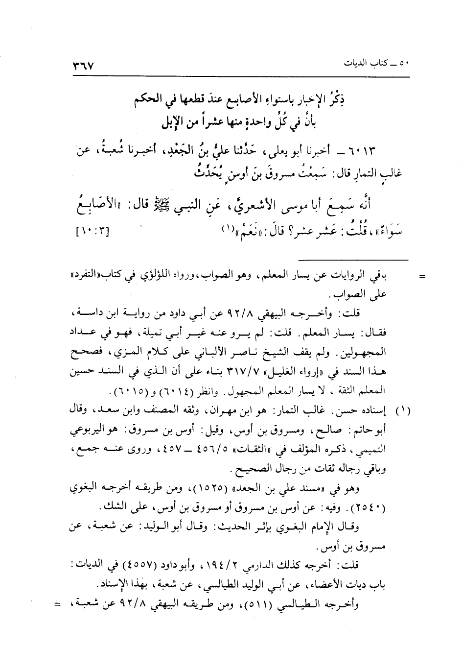 6013 ـ أَخْبَرَنَا أَبُو يَعْلَى، حَدَّثَنَا عَلِيُّ بْنُ الْجَعْدِ، أَخْبَرَنَا شُعْبَةُ، عَنِ غَالِبٍ التَّمَّارِ قَالَ: سَمِعْتُ مَسْرُوقَ بْنَ أَوْسٍ يُحَدِّثُ