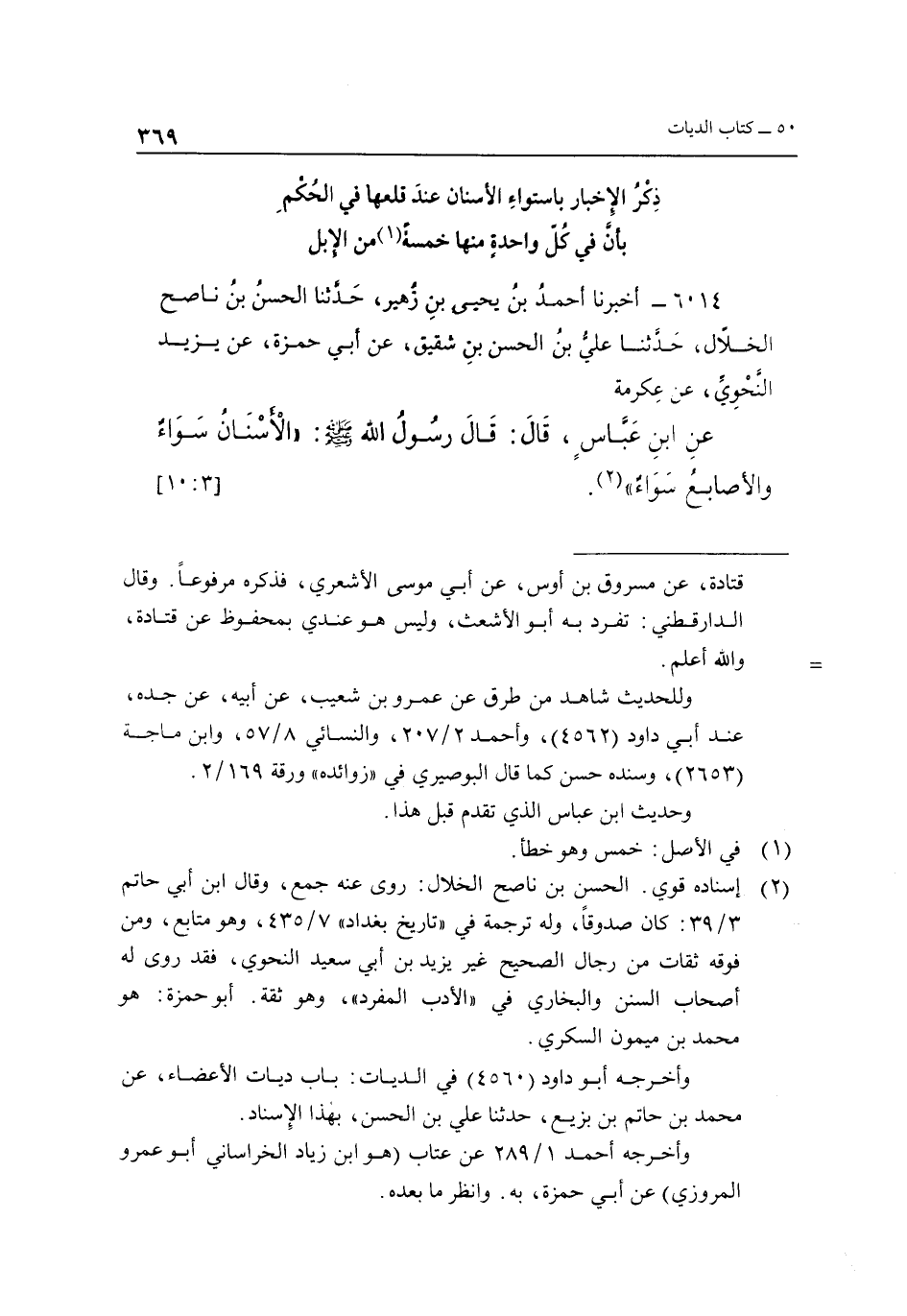 وأخرجه أبو داود "4560" في الديات: باب ديات الأعضاء، عن محمد بن حاتم بن يزيع، حدثنا علي بن الحسن، بهذا الإسناد.