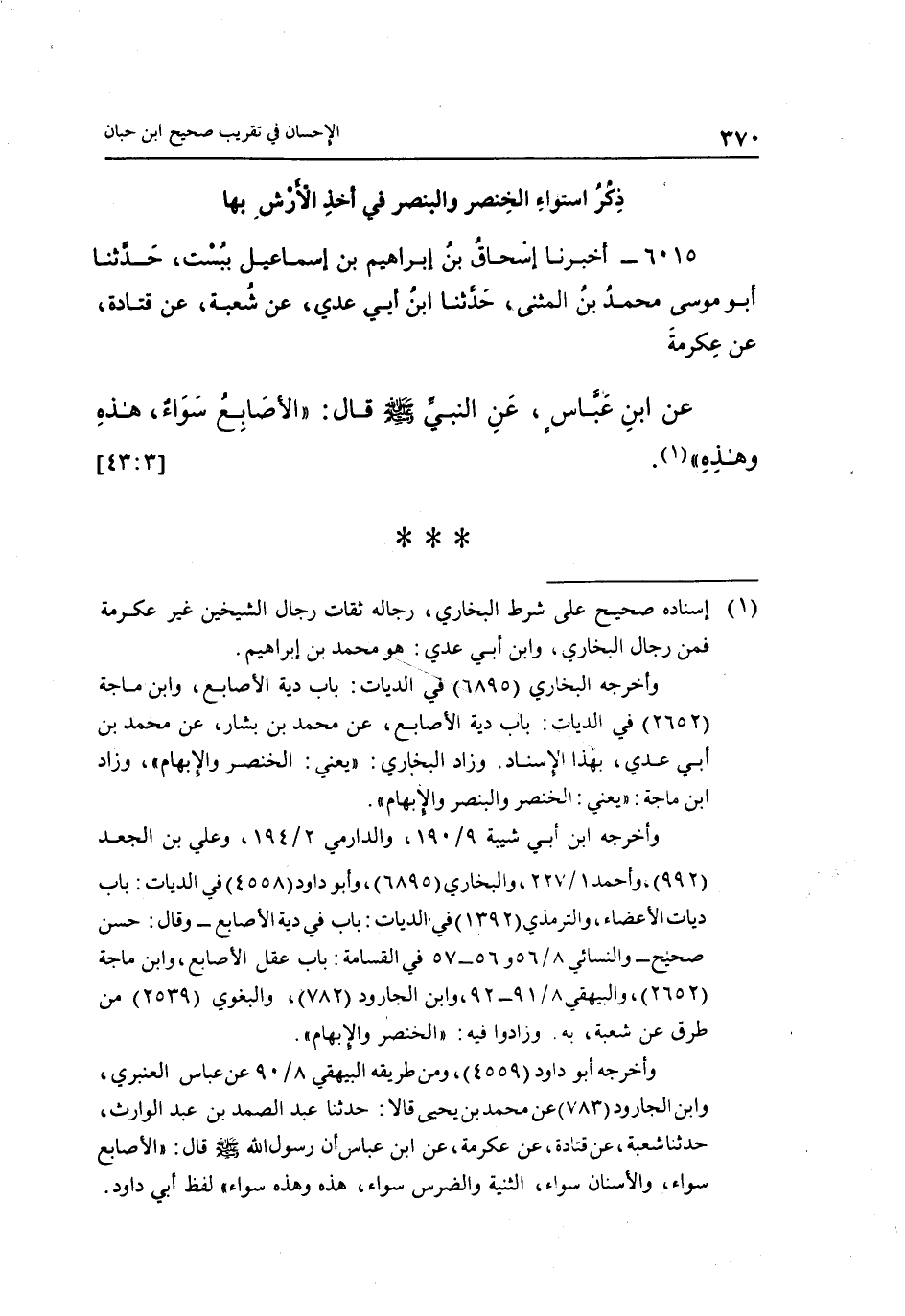 عن بن عَبَّاسٍ، عَنِ النَّبِيِّ صَلَّى اللَّهُ عَلَيْهِ وَسَلَّمَ قَالَ: "الأصابع سواء، هذه وهذه" 1 [43:3]