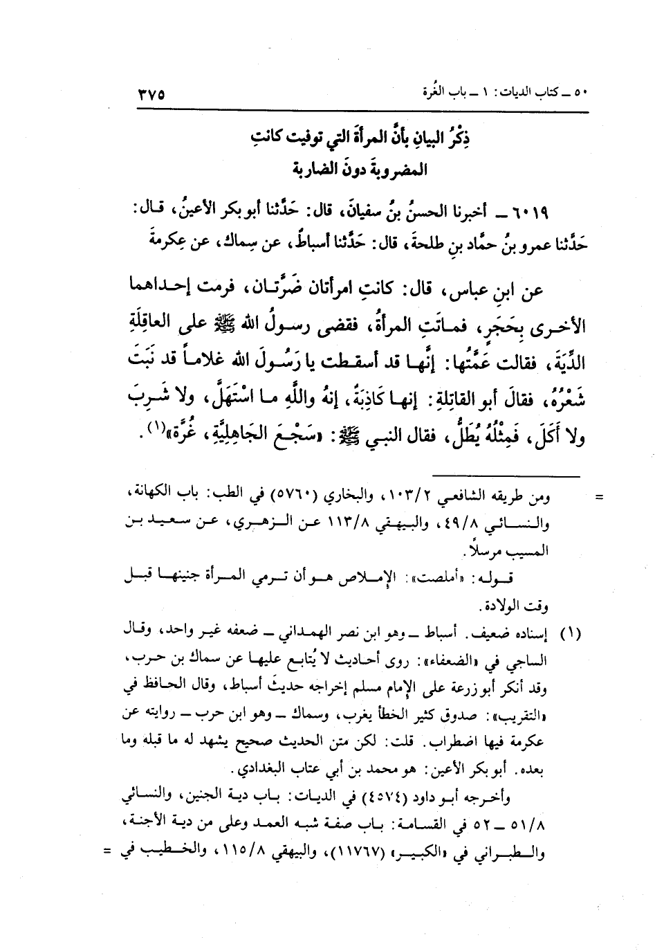 عن بن عَبَّاسٍ، قَالَ: كَانَتِ امْرَأَتَانِ ضَرَّتَانِ، فَرَمَتْ إِحْدَاهُمَا الْأُخْرَى بِحَجَرٍ، فَمَاتَتِ الْمَرْأَةُ، فَقَضَى رَسُولُ اللَّهِ صَلَّى اللَّهُ عَلَيْهِ وَسَلَّمَ عَلَى الْعَاقِلَةِ الدِّيَةَ، فَقَالَتْ عَمَّتُهَا: إِنَّهَا قَدْ أَسْقَطَتْ يَا رَسُولَ اللَّهِ غُلَامًا قَدْ نَبَتَ شَعْرُهُ، فَقَالَ أَبُو القاتلة: إنها كاذبة، إنه والله ما تسهل، وَلَا شَرِبَ، وَلَا أَكَلْ، فَمِثْلُهُ يُطَلُّ، فَقَالَ النَّبِيُّ صَلَّى اللَّهُ عَلَيْهِ وَسَلَّمَ: "سَجْعَ الْجَاهِلِيَّةِ، غرة" 1.