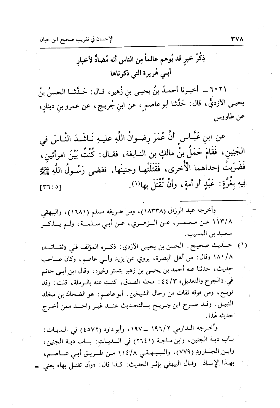 عَنِ بن عَبَّاسٍ أَنَّ عُمَرَ رِضْوَانُ اللَّهِ عَلَيْهِ نَاشَدَ النَّاسَ فِي الْجَنِينِ، فَقَامَ حَمَلُ بْنُ مَالِكِ بْنِ النَّابِغَةِ، فَقَالَ: كُنْتُ بَيْنَ امْرَأَتَيْنِ، فَضَرَبَتْ إِحْدَاهُمَا الْأُخْرَى، فَقَتَلَتْهَا وَجَنِينَهَا، فَقَضَى رَسُولُ اللَّهِ صَلَّى اللَّهُ عَلَيْهِ وَسَلَّمَ فِيهِ بِغُرَّةٍ: عَبْدٍ أو امة، وأن تقتل بها1. [36:5]