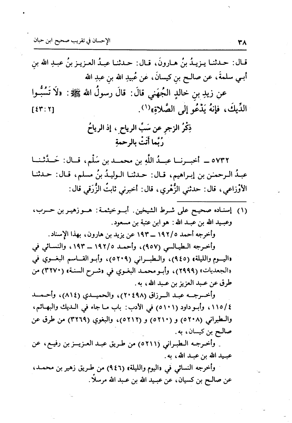 5732 - أَخْبَرَنَا عَبْدُ اللَّهِ بْنُ مُحَمَّدِ بْنِ سَلْمٍ، قَالَ: حَدَّثَنَا عَبْدُ الرَّحْمَنِ بْنُ إِبْرَاهِيمَ، قَالَ: حَدَّثَنَا الْوَلِيدُ بْنُ مُسْلِمٍ، قَالَ: حَدَّثَنَا الْأَوْزَاعِيُّ، قَالَ: حَدَّثَنِي الزُهْرِيُّ، قَالَ: أخبرني ثابت الزرقي قال: ذِكْرُ الزَّجْرِ عَنْ سَبِّ الرِّيَاحِ، إِذِ الرِّيَاحُ رُبَّمَا أَتَتْ بِالرَّحْمَةِ