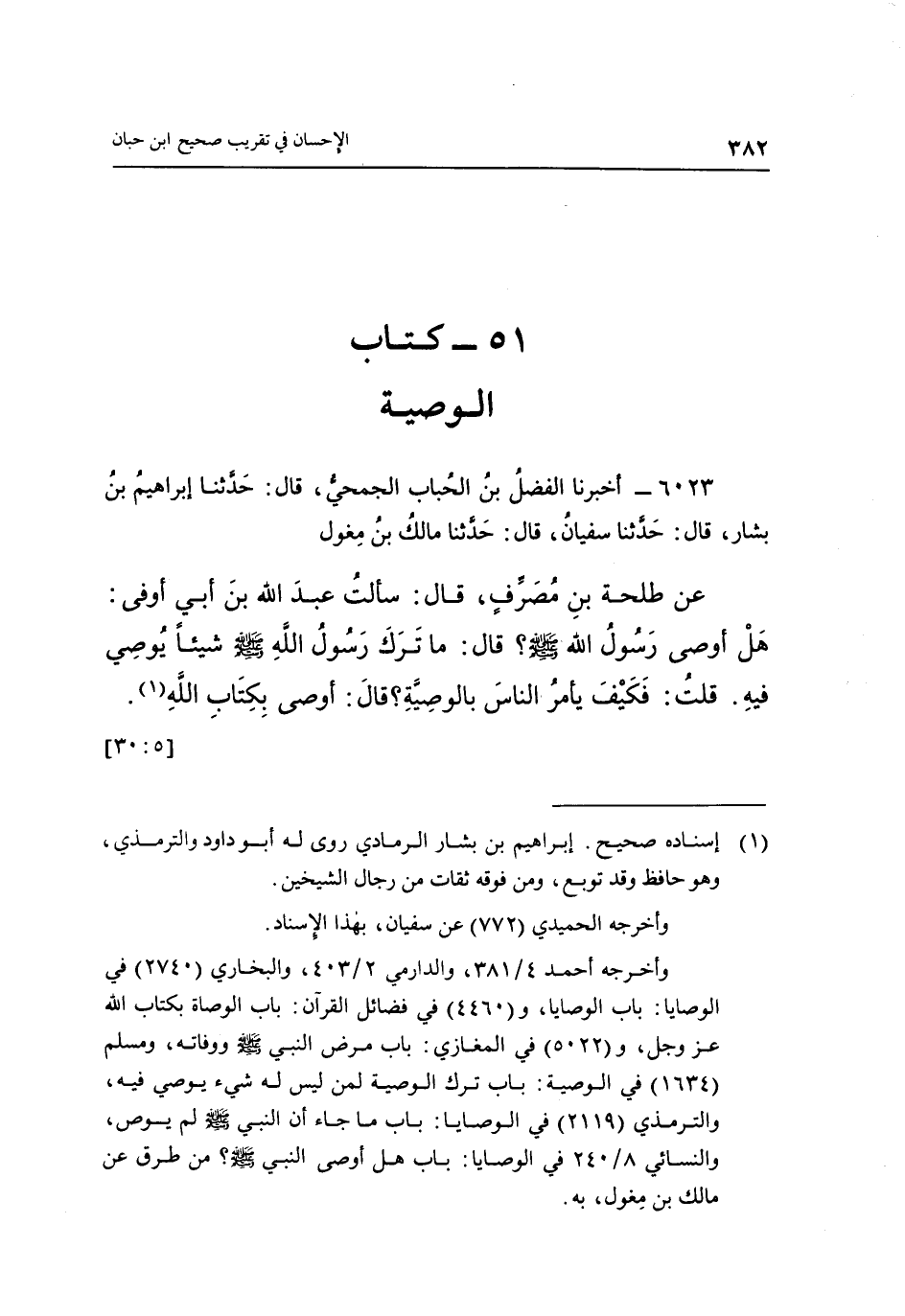 عَنْ طَلْحَةَ بْنِ مُصَرِّفٍ، قَالَ: سَأَلْتُ عَبْدَ اللَّهِ بْنَ أَبِي أَوْفَى: هَلْ أَوْصَى رَسُولُ اللَّهِ صَلَّى اللَّهُ عَلَيْهِ وَسَلَّمَ؟ قَالَ: مَا تَرَكَ رَسُولَ اللَّهِ صَلَّى اللَّهُ عَلَيْهِ وَسَلَّمَ شَيْئًا يُوصِي فِيهِ. قُلْتُ: فَكَيْفَ يَأْمُرُ النَّاسَ بِالْوَصِيَّةِ؟ قال: أوصى بكتاب الله 1. [30:5]