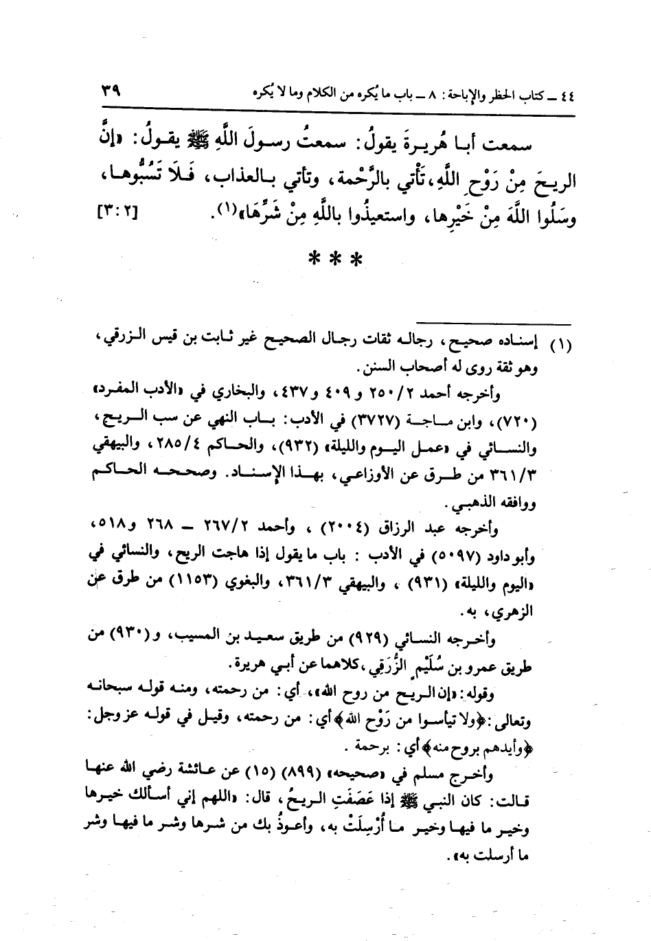 الرِّيحُ مِنْ رَوْحِ اللَّهِ، تَأْتِي بِالرَّحْمَةِ، وَتَأْتِي بِالْعَذَابِ، فَلَا تَسُبُّوهَا، وَسَلُوا اللَّهَ مِنْ خَيْرِهَا، وَاسْتَعِيذُوا بالله من شرها" 1