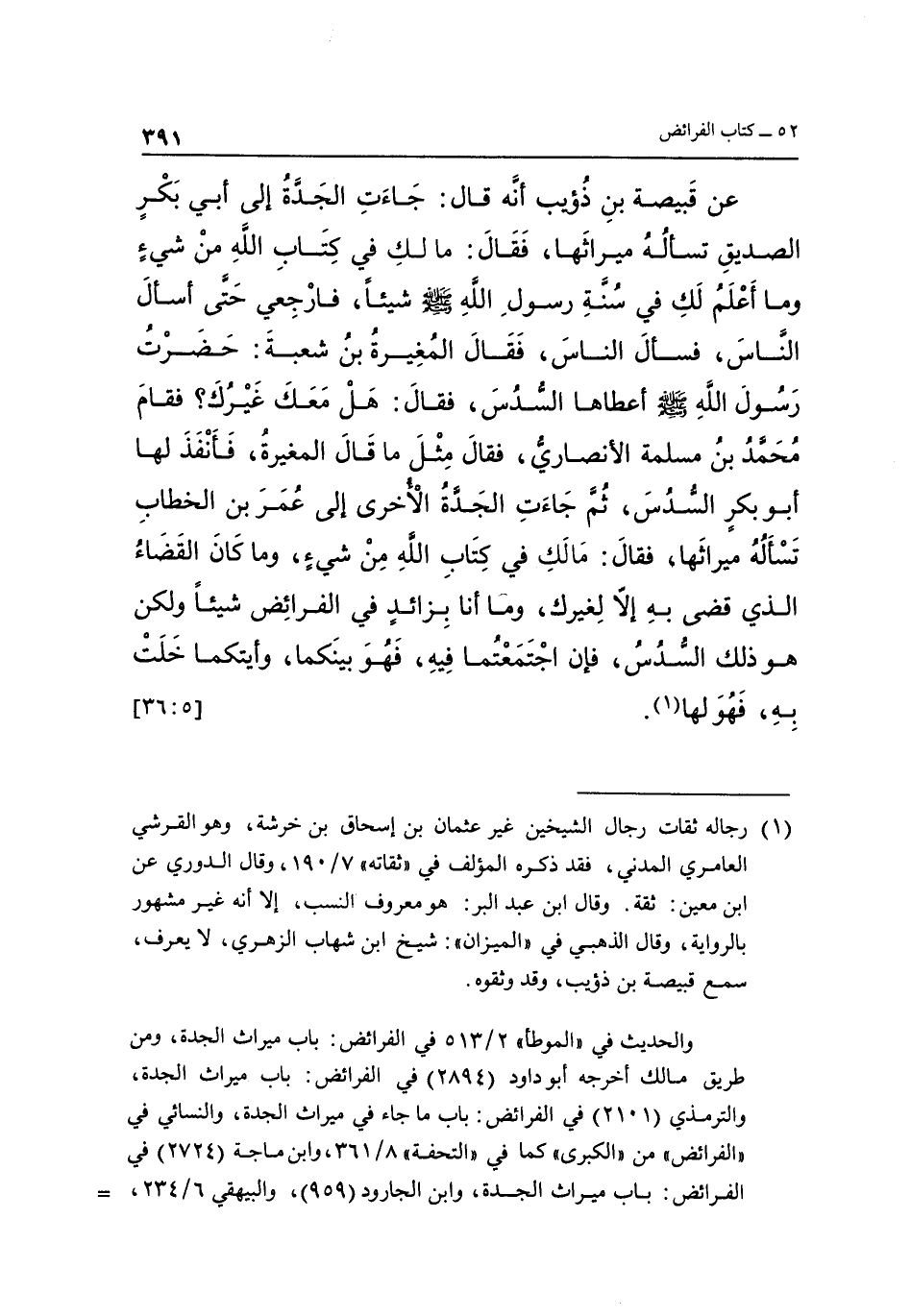عَنْ قَبِيصَةَ بْنِ ذُؤَيْبٍ أَنَّهُ قَالَ: جَاءَتِ الْجَدَّةُ إِلَى أَبِي بَكْرٍ الصِّدِّيقِ تَسْأَلُهُ مِيرَاثَهَا، فَقَالَ: مَا لَكِ فِي كِتَابِ اللَّهِ مِنْ شَيْءٍ وَمَا أَعْلَمُ لَكِ فِي سُنَّةِ رَسُولَ اللَّهِ صَلَّى اللَّهُ عَلَيْهِ وَسَلَّمَ شَيْئًا، فَارْجِعِي حَتَّى أَسْأَلَ النَّاسَ، فَسَأَلَ النَّاسَ، فَقَالَ الْمُغِيرَةُ بْنُ شُعْبَةَ: حَضَرْتُ رَسُولَ اللَّهِ صَلَّى اللَّهُ عَلَيْهِ وَسَلَّمَ أَعْطَاهَا السُّدُسَ، فَقَالَ: هَلْ مَعَكَ غَيْرُكَ؟ فَقَامَ مُحَمَّدُ بْنُ مَسْلَمَةَ الْأَنْصَارِيُّ، فَقَالَ مِثْلَ مَا قَالَ الْمُغِيرَةُ، فَأَنْفَذَ لَهَا أَبُو بَكْرٍ السُّدُسَ، ثُمَّ جَاءَتِ الْجَدَّةُ الْأُخْرَى إِلَى عمر بن الخطاب تسأله ميراثها، فقال: مالك فِي كِتَابِ اللَّهِ مِنْ شَيْءٍ، وَمَا كَانَ الْقَضَاءُ الَّذِي قَضَى بِهِ إِلَّا لِغَيْرِكِ، وَمَا أَنَا بِزَائِدٍ فِي الْفَرَائِضِ شَيْئًا وَلَكِنْ هُوَ ذَلِكَ السُّدُسُ، فَإِنِ اجْتَمَعْتُمَا فِيهِ، فَهُوَ بَيْنَكُمَا، وأيتكما خلت به، فهو لها1. [36:5]