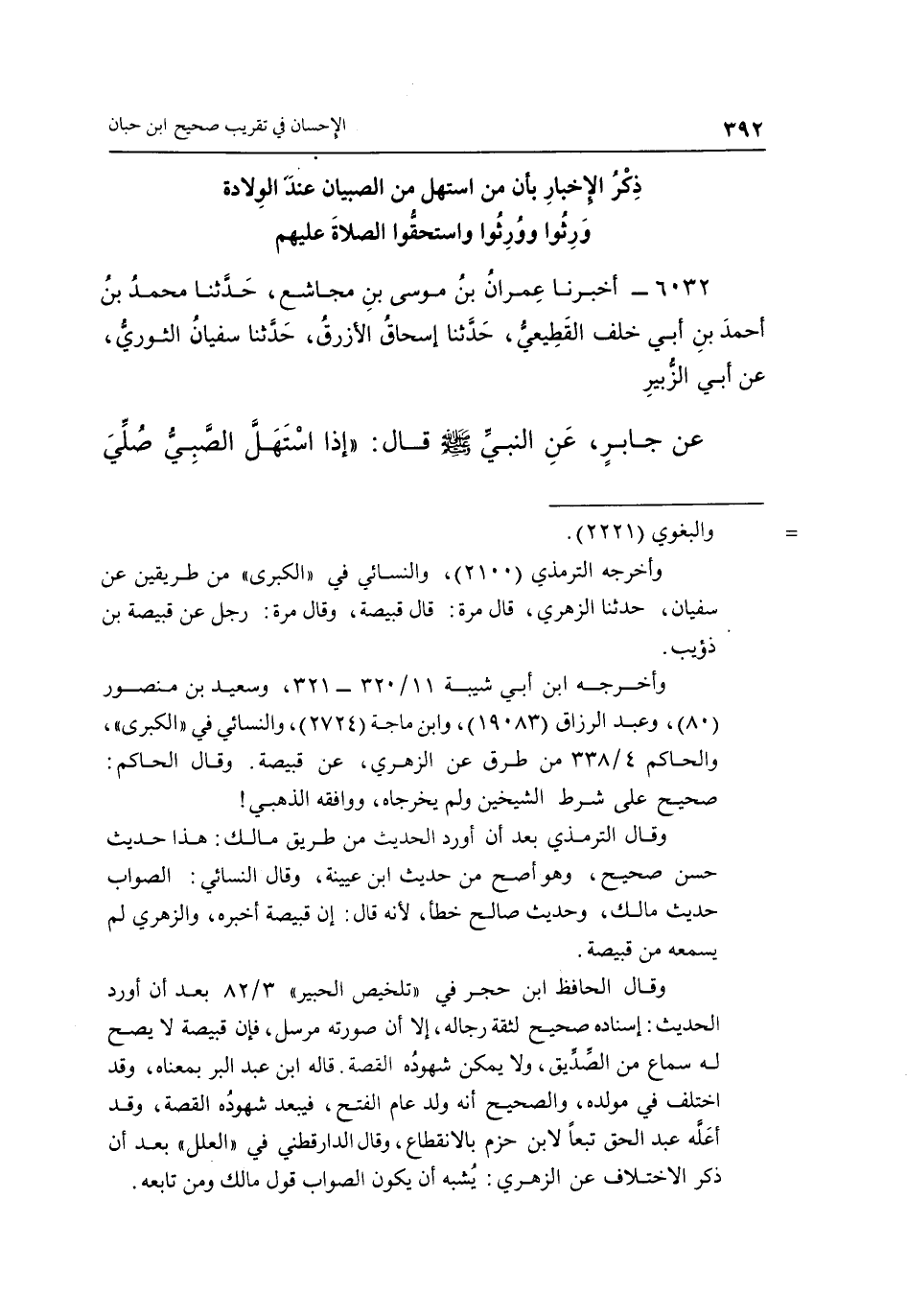 6032 ـ أَخْبَرَنَا عِمْرَانُ بْنُ مُوسَى بْنِ مُجَاشِعٍ، حَدَّثَنَا مُحَمَّدُ بْنُ أَحْمَدَ بْنِ أَبِي خَلَفٍ الْقَطِيعِيُّ، حَدَّثَنَا إِسْحَاقُ الْأَزْرَقُ، حَدَّثَنَا سُفْيَانُ الثَّوْرِيُّ، عَنْ أَبِي الزُّبَيْرِ عَنْ جَابِرٍ، عَنِ النَّبِيِّ صَلَّى اللَّهُ عَلَيْهِ وَسَلَّمَ قَالَ: "إِذَا اسْتَهَلَّ الصَّبِيُّ صلي