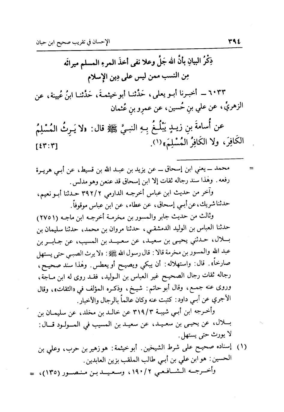 عَنْ أُسَامَةَ بْنِ زَيْدٍ يَبْلُغُ بِهِ النَّبِيَّ صَلَّى اللَّهُ عَلَيْهِ وَسَلَّمَ قَالَ: "لَا يَرِثُ الْمُسْلِمُ الْكَافِرَ، وَلَا الكافر المسلم" 1. [43:3]