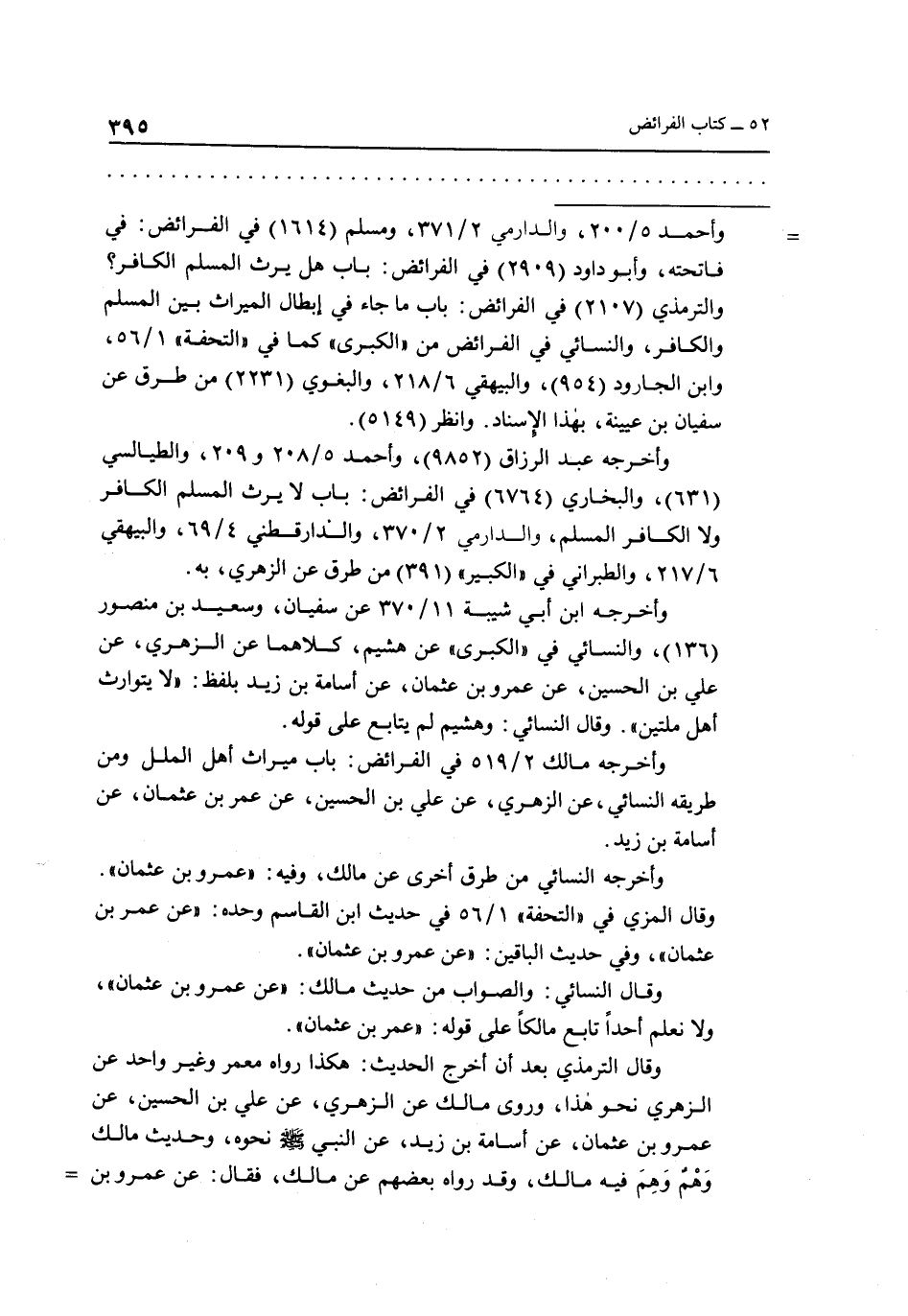 وأخرجه مالك 2/519 في الفرائض: باب ميراث أهل الملل ومن طريقه النسائي، عن الزهري، عن علي بن الحسين، عن عمرو بن عثمان، عن أسامة بن زيد.