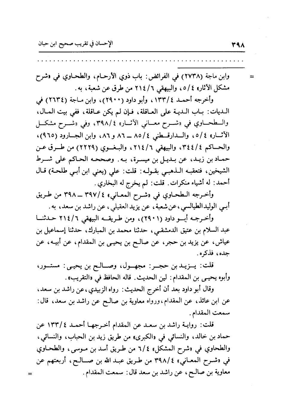 قلت: رواية راشد بن سعد عن المقدام أخرجها أحمد 4/133 عن حماد بن خالد، والنسائي في "الكبرى" من طريق زيد بن الحباب، والنسائي، والطحاوي في "شرح المشكل" 4/6 من طريق أسد بن موسى، والطحاوي في "شرح المعاني" 4/398 من طريق عبد الله بن صالح، أربعتهم عن معاوية بن صالح، عن راشد بن سعد قال: سمعت المقدام. =