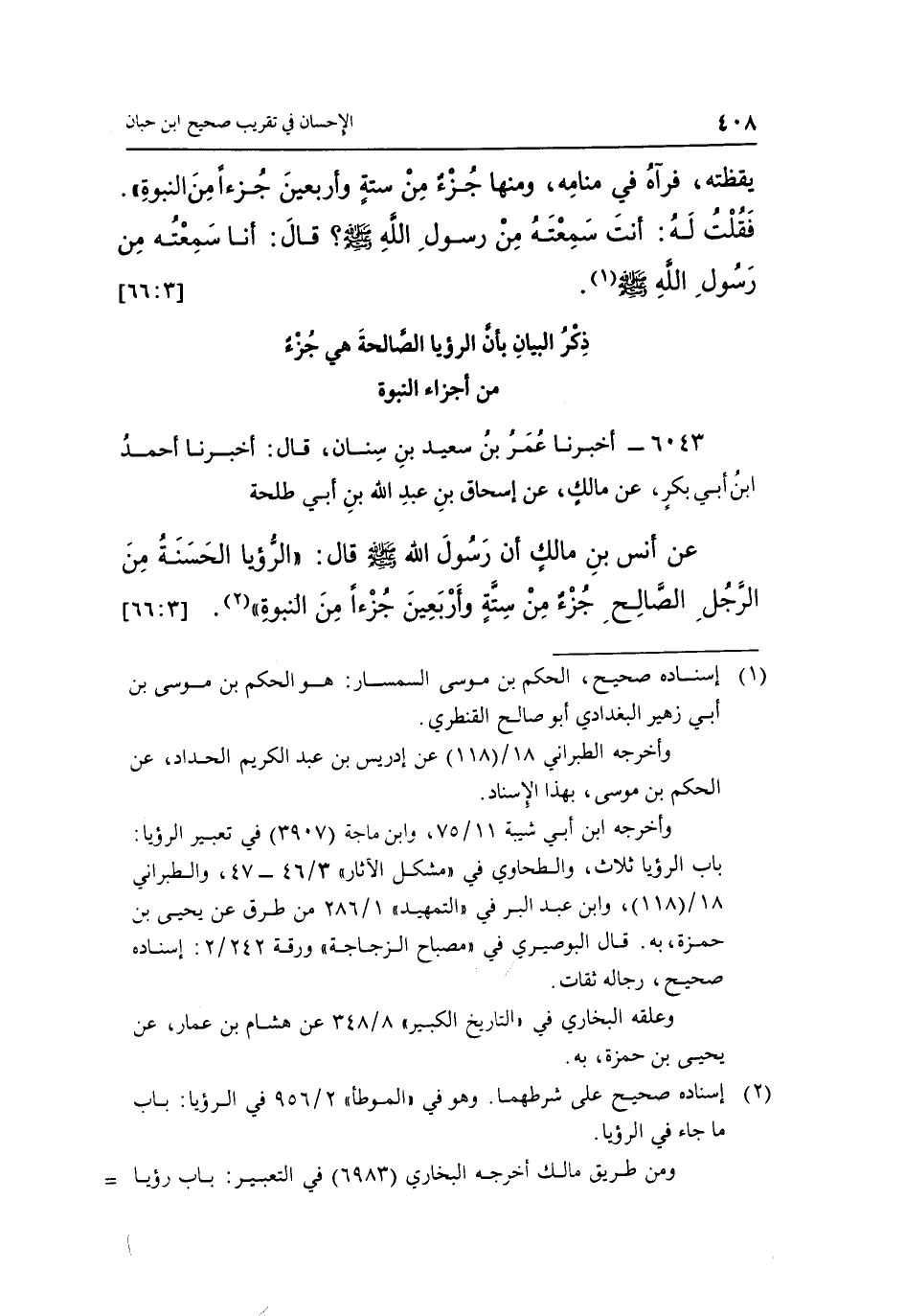 عَنْ أَنَسِ بْنِ مَالِكٍ أَنَّ رَسُولَ اللَّهِ صَلَّى اللَّهُ عَلَيْهِ وَسَلَّمَ قَالَ: "الرُّؤْيَا الْحَسَنَةُ مِنَ الرَّجُلِ الصَّالِحِ جُزْءٌ مِنْ سِتَّةٍ وَأَرْبَعِينَ جُزْءًا مِنَ النُّبُوَّةِ" 2. [66:3]