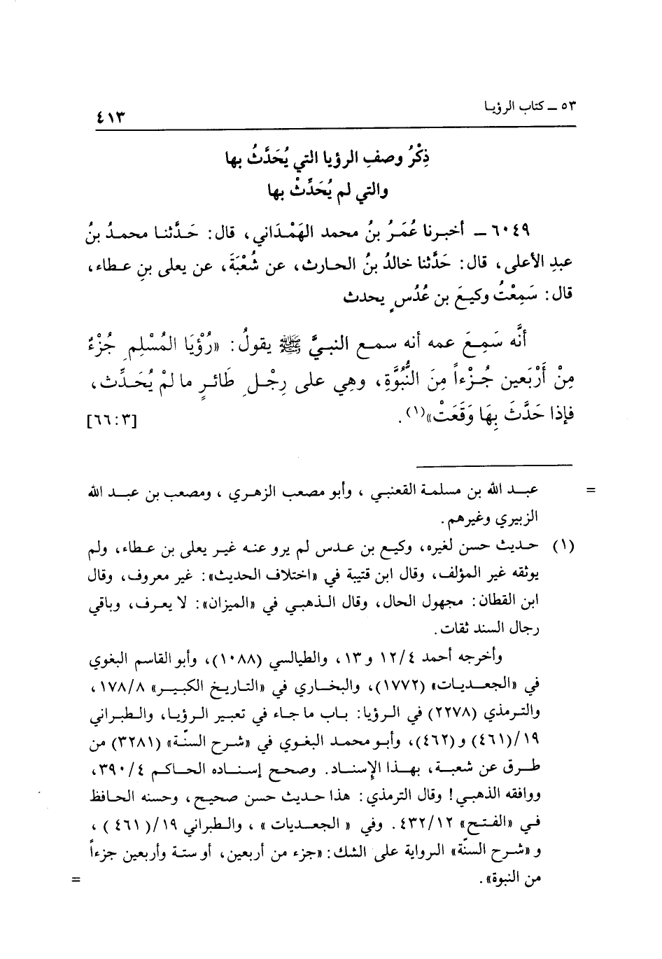 أَنَّهُ سَمِعَ عَمَّهُ أَنَّهُ سَمِعَ النَّبِيَّ صَلَّى اللَّهُ عَلَيْهِ وَسَلَّمَ يَقُولُ: "رُؤْيَا الْمُسْلِمِ جُزْءٌ مِنْ أَرْبَعِينَ جُزْءًا مِنَ النُّبُوَّةِ، وَهِيَ عَلَى رِجْلِ طَائِرٍ مَا لَمْ يحدث، فإذا حدث بها وقعت" 1. [66:3]