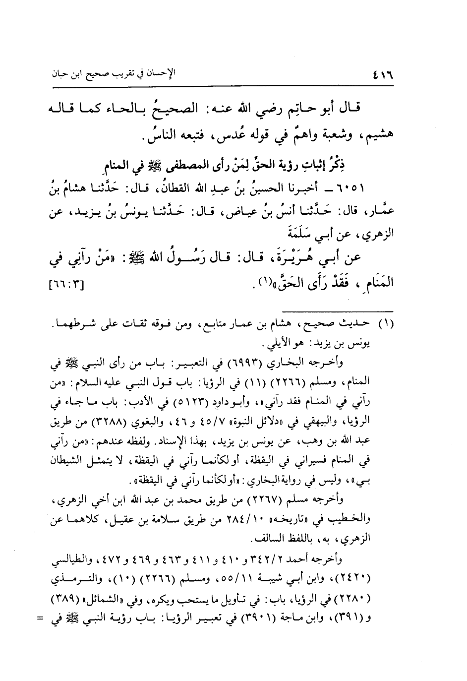6051 ـ أَخْبَرَنَا الْحُسَيْنُ بْنُ عَبْدِ اللَّهِ الْقَطَّانُ، قَالَ: حَدَّثَنَا هِشَامُ بْنُ عَمَّارٍ، قَالَ: حَدَّثَنَا أَنَسُ بْنُ عِيَاضٍ، قَالَ: حَدَّثَنَا يُونُسُ بْنُ يَزِيدَ، عَنِ الزُّهْرِيِّ، عَنْ أَبِي سَلَمَةَ عَنْ أَبِي هُرَيْرَةَ، قَالَ: قَالَ رَسُولُ اللَّهِ صَلَّى اللَّهُ عَلَيْهِ وَسَلَّمَ: "مَنْ رَآنِي فِي الْمَنَامِ، فَقَدْ رَأَى الحق" 1. [66:3]