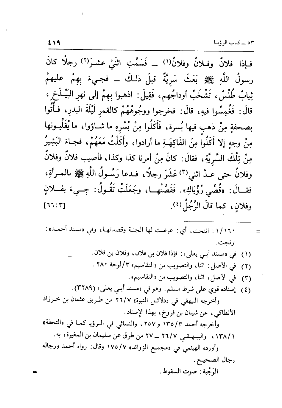 فَإِذَا فُلَانٌ وَفُلَانٌ وَفُلَانٌ1 ـ فَسَمَّتِ اثْنَيْ عَشَرَ رَجُلًا2 كَانَ رَسُولُ اللَّهِ صَلَّى اللَّهُ عَلَيْهِ وَسَلَّمَ بعث سرية قبل ذلك ـ فجئ بِهِمْ عَلَيْهِمْ ثِيَابٌ طُلْسٌ، تَشْخَبُ أَوْدَاجُهُمْ، فَقِيلَ: اذْهَبُوا بِهِمْ إِلَى نَهَرِ الْبَيْذَخِ، قَالَ: فَغُمِسُوا فيه، قال: فخرجوا ووجوهم كَالْقَمَرِ لَيْلَةَ الْبَدْرِ، فَأُتُوا بِصَحْفَةٍ مِنْ ذَهَبٍ فيها بسرة، فاكلوا من بسره ما شاؤوا، مَا يُقَلِّبُونَهَا مِنْ وَجْهٍ إِلَّا أَكَلُوا مِنَ الْفَاكِهَةِ مَا أَرَادُوا، وَأَكَلْتُ مَعَهُمْ، فَجَاءَ الْبَشِيرُ مِنْ تِلْكَ السَّرِيَّةِ، فَقَالَ: كَانَ مِنْ أَمْرِنَا كَذَا وَكَذَا، فَأُصِيبَ فُلَانٌ وَفُلَانٌ وَفُلَانٌ حَتَّى عد اثنى3 عشرة رَجُلًا، فَدَعَا رَسُولُ اللَّهِ صَلَّى اللَّهُ عَلَيْهِ وَسَلَّمَ بِالْمَرْأَةِ، فَقَالَ: "قُصِّي رُؤْيَاكِ" فَقَصَّتْهَا، وَجَعَلَتْ تَقُولُ: جِيءَ بِفُلَانٍ وَفُلَانٍ، كَمَا قَالَ الرَّجُلُ4. [66:3]