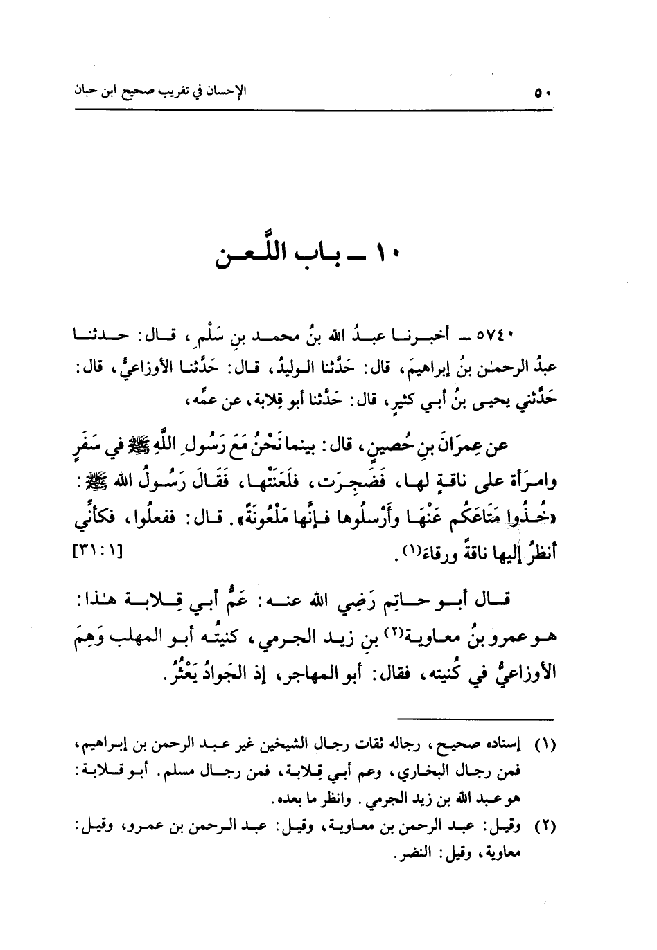 عَنْ عِمْرَانَ بْنِ حُصَيْنٍ، قَالَ: بَيْنَمَا نَحْنُ مَعَ رَسُولِ اللَّهِ صَلَّى اللَّهُ عَلَيْهِ وَسَلَّمَ فِي سَفَرٍ وَامْرَأَةٌ عَلَى نَاقَةٍ لَهَا، فَضَجرَتْ، فَلَعَنَتْهَا، فَقَالَ رَسُولُ اللَّهِ صَلَّى اللَّهُ عَلَيْهِ وَسَلَّمَ: "خُذُوا مَتَاعَكُمْ عَنْهَا وَأَرْسِلُوهَا فَإِنَّهَا مَلْعُونَةٌ: قَالَ: فَفَعَلُوا، فَكَأَنِّي أَنْظُرُ إِلَيْهَا نَاقَةً وَرْقَاءَ" 1. [31:1]