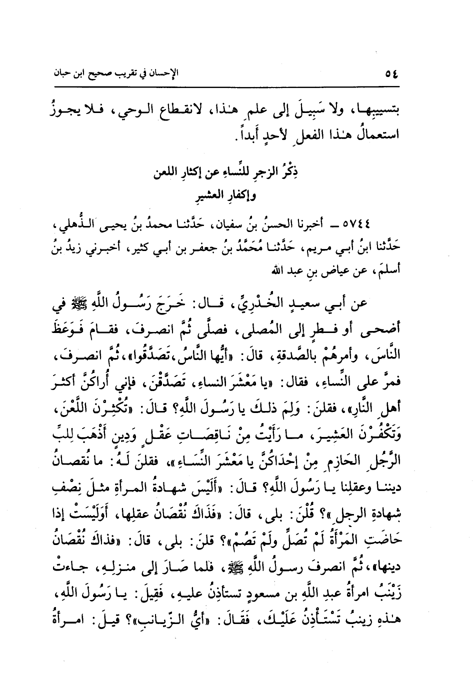 عَنْ أَبِي سَعِيدٍ الْخُدْرِيِّ، قَالَ: خَرَجَ رَسُولُ اللَّهِ صَلَّى اللَّهُ عَلَيْهِ وَسَلَّمَ فِي أَضْحًى أَوْ فِطْرٍ إِلَى الْمُصَلَّى، فَصَلَّى ثُمَّ انْصَرَفَ، فَقَامَ فَوَعَظَ النَّاسَ، وَأَمَرَهُمْ بِالصَّدَقَةِ، قَالَ: "أَيُّهَا النَّاسُ تَصَدَّقُوا" ثُمَّ انصرف، فمر عي النِّسَاءِ، فَقَالَ: "يَا مَعْشَرَ النِّسَاءِ تَصَدَّقْنَ، فَإِنِّي أَرَاكُنَّ أَكْثَرَ أَهْلِ النَّارِ" فَقُلْنَ: وَلِمَ ذَلِكَ يا رسول الله؟ قال: "تكثرون اللَّعْنَ، وَتَكْفُرْنَ الْعَشِيرَ، مَا رَأَيْتُ مِنَ نَاقِصَاتِ عَقْلٍ وَدِينٍ أَذْهَبَ لِلُبِّ الرَّجُلِ الْحَازِمِ مِنْ إِحْدَاكُنَّ يَا مَعْشَرَ النِّسَاءِ" فَقُلْنَ لَهُ: مَا نقصان ديننا وعقلنا يا رسول اللهظ قَالَ: " أَلَيْسَ شَهَادَةُ الْمَرْأَةِ مِثْلَ نِصْفِ شَهَادَةِ الرَّجُلِ"؟ قُلْنَ: بَلَى، قَالَ: "فَذَاكَ نُقْصَانُ عَقْلِهَا، أَوَ لَيْسَتْ إِذَا حَاضَتِ الْمَرْأَةُ لَمْ تُصَلِّ وَلَمْ تَصُمْ"؟ قُلْنَ بَلَى: قَالَ: "فَذَاكَ نُقْصَانُ دِينِهَا" ثُمَّ انْصَرَفَ رَسُولُ اللَّهِ صَلَّى اللَّهُ عَلَيْهِ وَسَلَّمَ، فَلَمَّا صَارَ إِلَى مَنْزِلِهِ، جَاءَتْ زينت امْرَأَةُ عَبْدِ اللَّهِ بْنِ مَسْعُودٍ تَسْتَأْذِنُ عَلَيْهِ، فقيل: يا رسول الله هذه زينت تستاذن عليك، فقال: "أي الزيانب" قيل: امرأةذكر الزَّجْرِ لِلنِّسَاءِ عَنْ إِكْثَارِ اللَّعْنِ وَإِكْفَارِ الْعَشِيرِ
