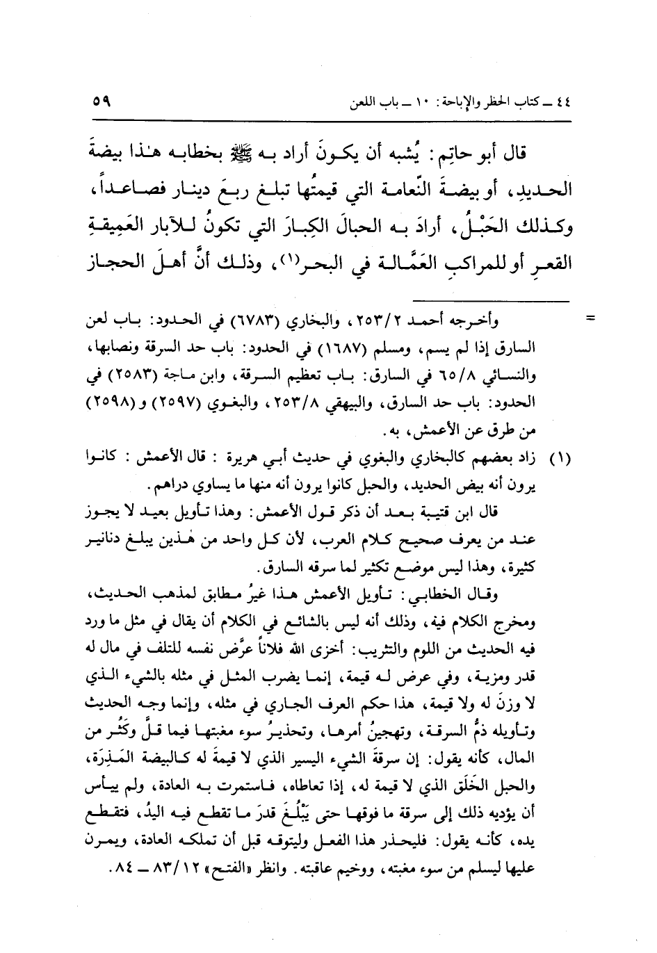 قَالَ أَبُو حَاتِمٍ: يُشْبِهُ أَنْ يَكُونَ أَرَادَ بِهِ صَلَّى اللَّهُ عَلَيْهِ وَسَلَّمَ بِخِطَابِهِ هَذَا بَيْضَةَ الْحَدِيدِ، أَوْ بَيْضَةَ النَّعَامَةِ الَّتِي قِيمَتُهَا تَبْلُغُ رُبْعَ دِينَارٍ فَصَاعِدًا، وَكَذَلِكَ الْحَبْلُ، أَرَادَ بِهِ الْحِبَالَ الْكِبَارَ الَّتِي تَكُونُ لِلْآبَارِ الْعَمِيقَةِ الْقَعْرِ أَوْ لِلْمَرَاكِبِ العمَّالة فِي الْبَحْرِ1، وَذَلِكَ ان أهل الحجاز