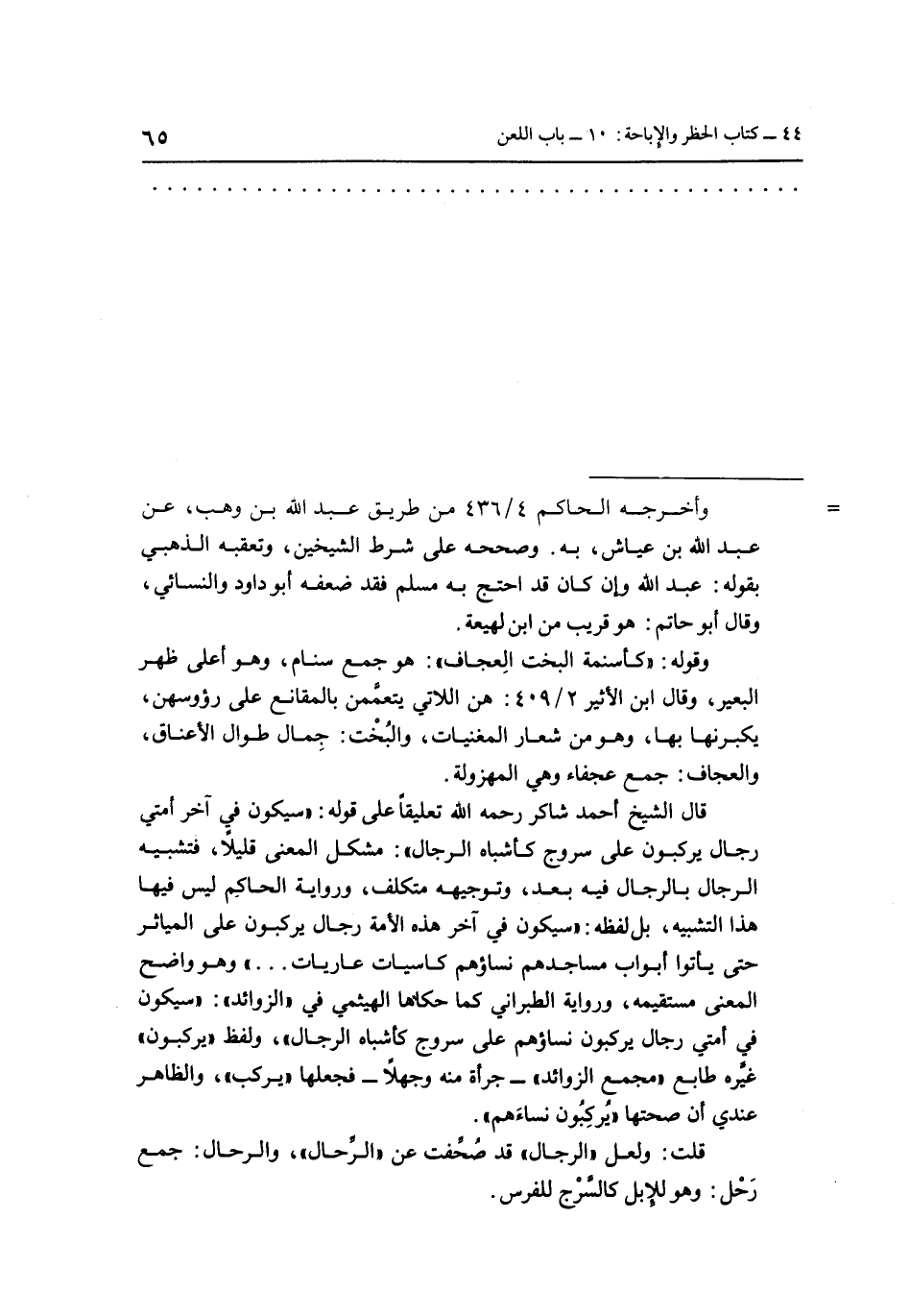 قال الشيخ أحمد محمد شاكر رحمه الله تعليقاً على قوله: "سيكون في آخر أمتي رجال يركبون على سروج كأشباه الرجال": مشكل المعنى قليلأ، فتشبيه الرجال بالرجال فيه بعد، وتوجييه متكلف، ورواية الحاكم ليس فيها هذا التشبيه، بل لفظه: "سيكون في آخر هذه الأمة رجال يركبون على المياثر حتى يأتون أبواب مساجدهم نساؤهم كاسيات عاريات ... " وهو واضح المعنى مستقيمه، ورواية الطبراني كما حكاها الهيثمي في "الزوائد": "سيكون في أمتي رجال يركبون نساؤهم على سروج كأشباه الرجال"، ولفظ يركبون" غيَّر طابع "مجمع الزوائد" – جرأة منه وجهلا – فجعلها "يركب"، والظاهر عندي أن صحتها "يركبون نساءهم"
