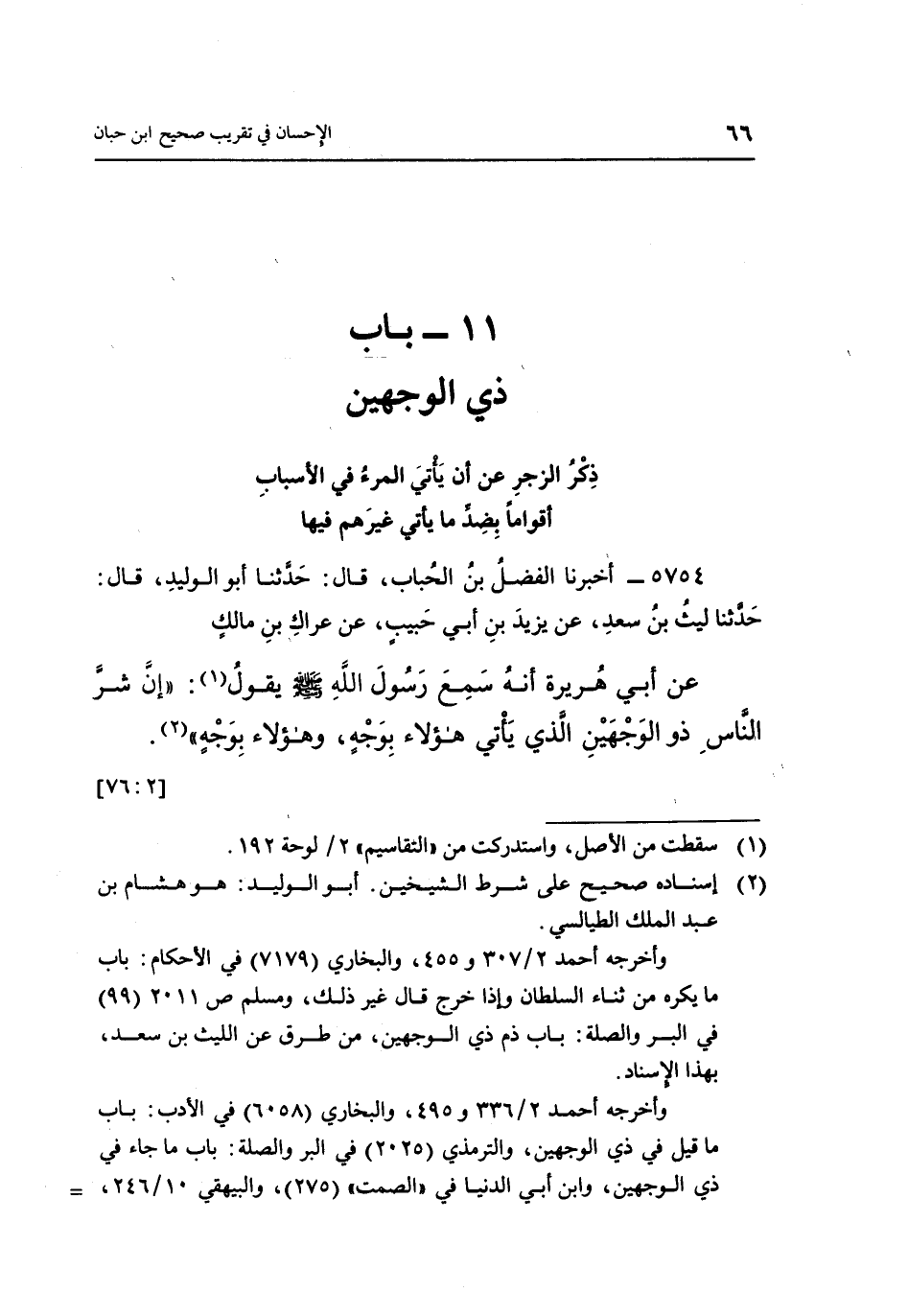 عَنْ أَبِي هُرَيْرَةَ إِنَّهُ سَمِعَ رَسُولَ اللَّهِ صَلَّى اللَّهُ عَلَيْهِ وَسَلَّمَ يَقُولُ1: "إِنَّ شَرَّ النَّاسِ ذُو الْوَجْهَيْنِ الذي يأتي هؤلاء بوجه وهؤلاء بوجه" 2 [76:2]