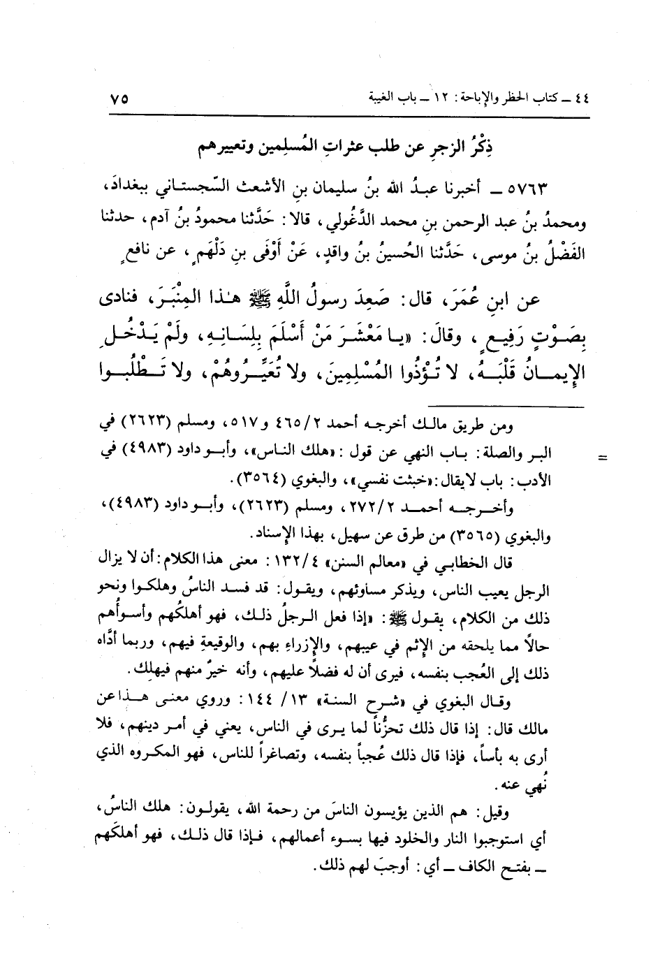 عن بن عُمَرَ، قَالَ: صَعِدَ رَسُولُ اللَّهِ صَلَّى اللَّهُ عَلَيْهِ وَسَلَّمَ هذ الْمِنْبَرَ، فَنَادَى بِصَوْتٍ رَفِيعٍ، وَقَالَ: "يَا مَعْشَرَ مَنْ أَسْلَمَ بِلِسَانِهِ، وَلَمْ يَدْخُلِ الْإِيمَانُ قَلْبَهُ، لَا تُؤْذُوا الْمُسْلِمِينَ، وَلَا تُعَيِّرُوهُمْ وَلَا تَطْلُبُوا،