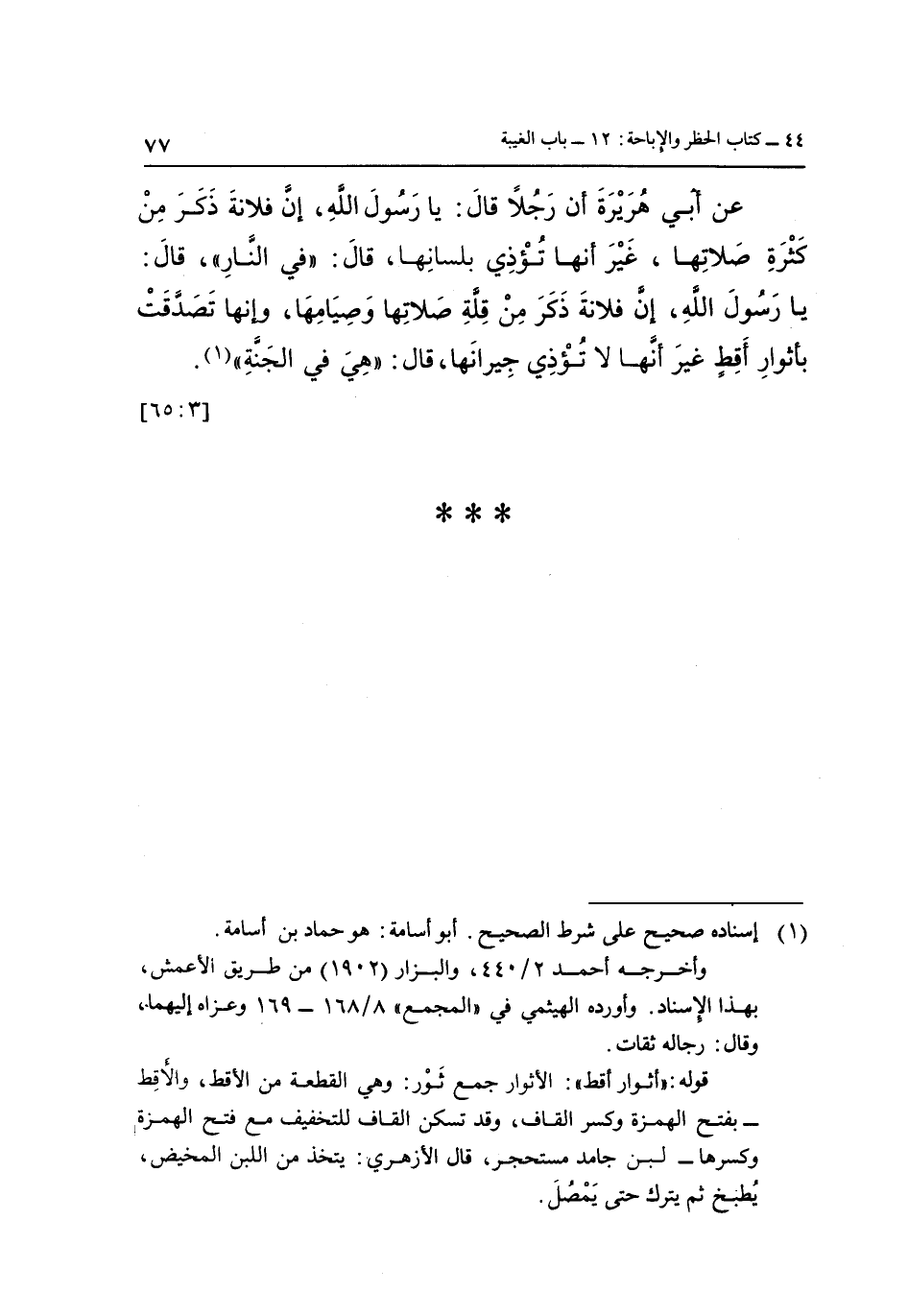 عَنْ أَبِي هُرَيْرَةَ أَنَّ رَجُلًا قَالَ: يَا رَسُولَ اللَّهِ، إِنَّ فُلَانَةً ذَكَرَ مِنْ كَثْرَةِ صلاته، اغَيْرَ أَنَّهَا تُؤْذِي بِلِسَانِهَا، قَالَ: "فِي النَّارِ" قَالَ: يَا رَسُولَ اللَّهِ، إِنَّ فُلَانَةً ذَكَرَ من