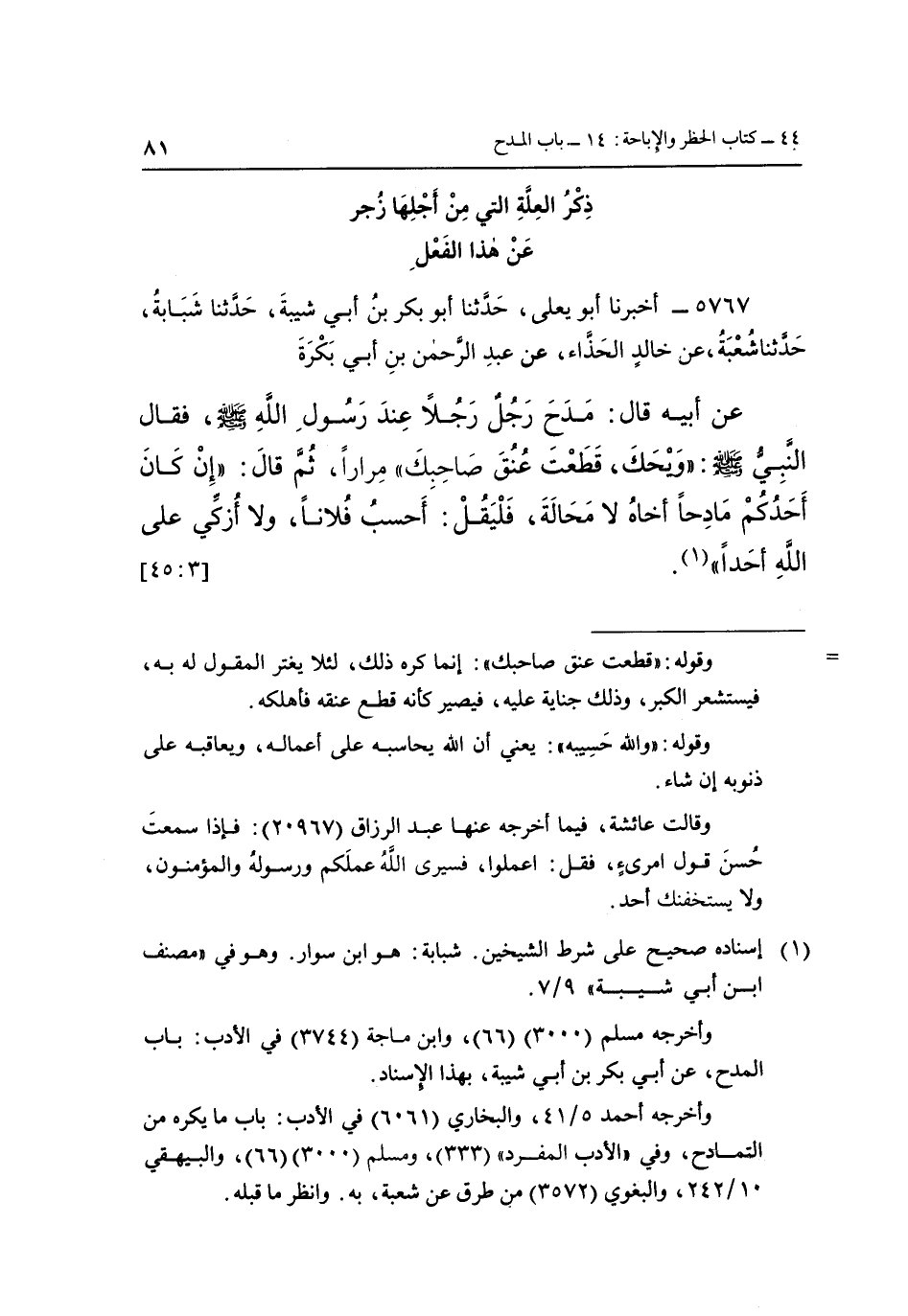 5767 - أَخْبَرَنَا أَبُو يَعْلَى، حَدَّثَنَا أَبُو بَكْرِ بْنُ أَبِي شَيْبَةَ، حَدَّثَنَا شَبَابَةُ، حَدَّثَنَا شُعْبَةُ، عَنْ خَالِدٍ الْحَذَّاءِ، عَنْ عَبْدِ الرَّحْمَنِ بْنِ أَبِي بَكْرَةَ، عَنْ أَبِيهِ، قَالَ: مَدَحَ رَجُلٌ رَجُلًا عِنْدَ رَسُولِ اللَّهِ صَلَّى اللَّهُ عَلَيْهِ وَسَلَّمَ، فَقَالَ النَّبِيُّ صَلَّى اللَّهُ عَلَيْهِ وَسَلَّمَ: «وَيْحَكَ قَطَعْتَ عُنُقَ صَاحِبِكَ» مِرَارًا، ثُمَّ قَالَ: «إِنْ كَانَ §أَحَدُكُمْ مَادِحًا أَخَاهُ لَا مَحَالَةَ، فَلْيَقُلْ: أَحْسِبُ فُلَانًا، وَلَا أُزَكِّي عَلَى اللَّهِ أَحَدًا»