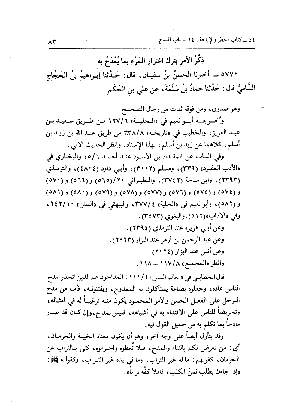 قال الخطابي: في "معالم السنن" 4/111: المداحون هم الذين اتخذوا مدح الناس عادة، وجعلوه بضاعة يستأكلون به الممدوح، ويفتنونه، فأما من مدح الرجل على الفعل الحسن والأمر المحمود يكون منه ترغيباً له في أمثاله، وتحريضاَ للناس على الإقتداء به في أشباهه، فليس بمدح، وإن صار مادحاً بما تكلم به من جميل القول فيه.
