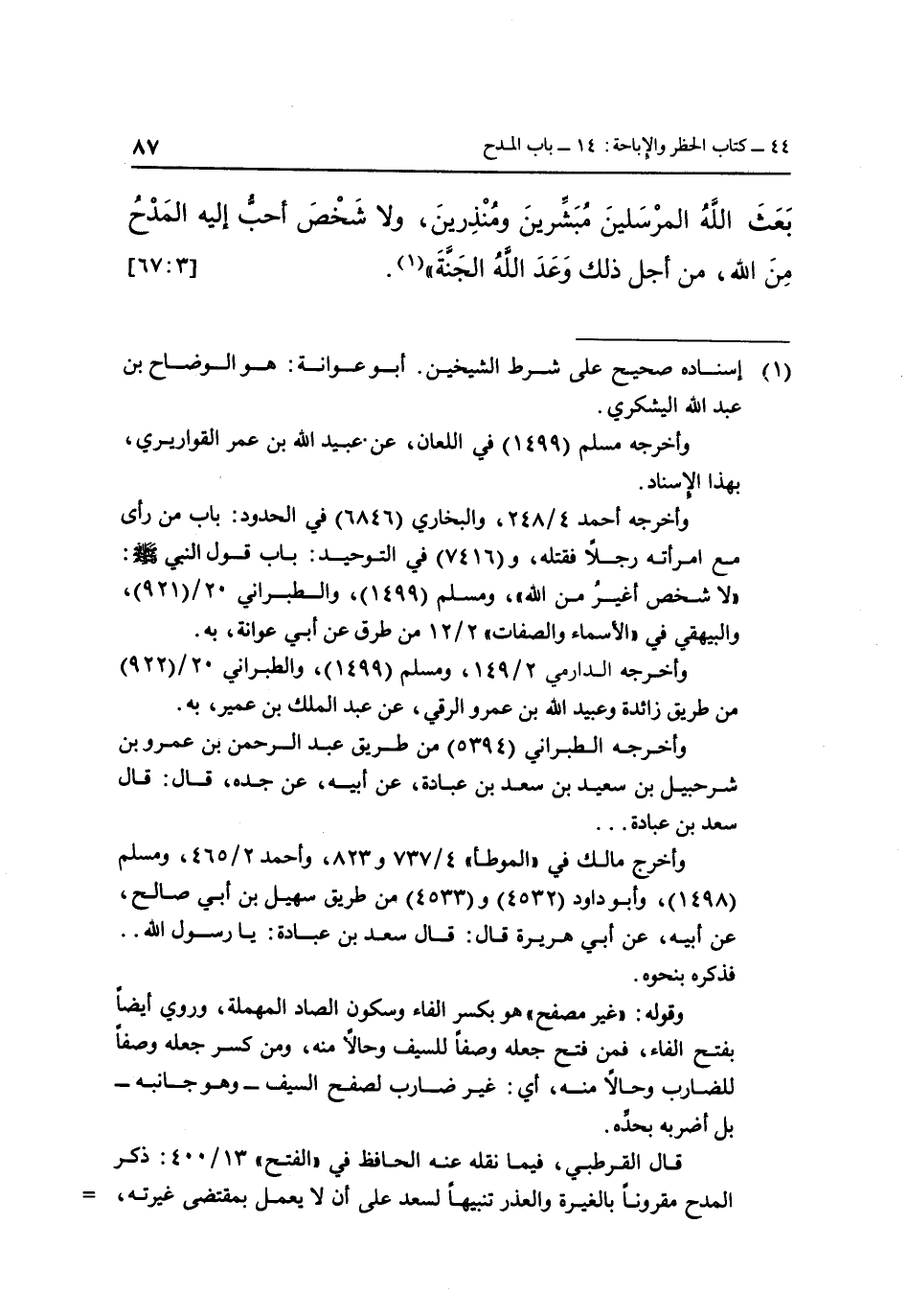 بَعَثَ اللَّهُ الْمُرْسَلِينَ مُبَشِّرِينَ وَمُنْذِرِينَ، وَلَا شَخَصَ أَحَبُّ إِلَيْهِ الْمَدْحُ مِنَ اللَّهِ، مِنْ أَجْلِ ذلك وعد الله الجنة" 1