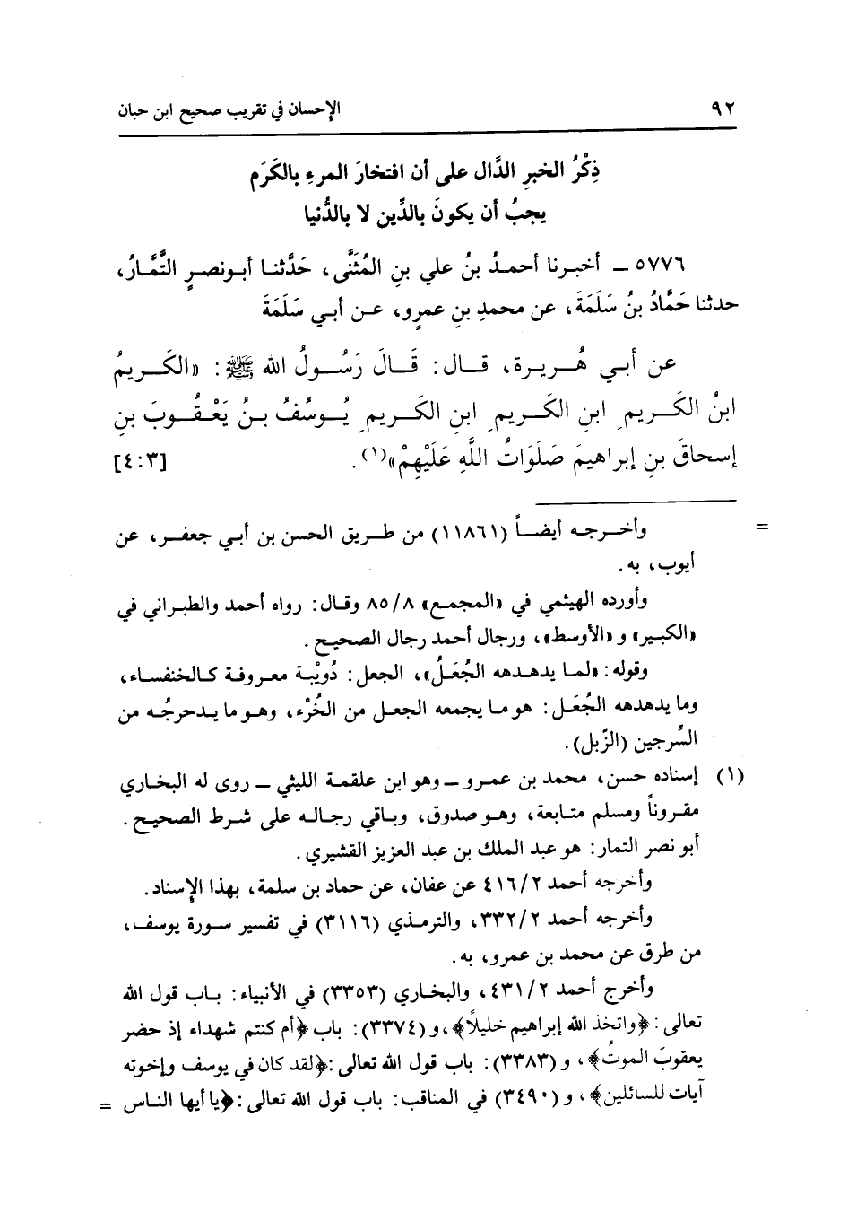 عَنْ أَبِي هُرَيْرَةَ قَالَ قَالَ رَسُولُ اللَّهِ صَلَّى اللَّهُ عَلَيْهِ وَسَلَّمَ "الكريم بن الكريم بن الكريم بن الْكَرِيمِ يُوسُفُ بْنُ يَعْقُوبَ بْنِ إِسْحَاقَ بْنِ إبراهيم صلوات الله عليهم" 1 [4:3]