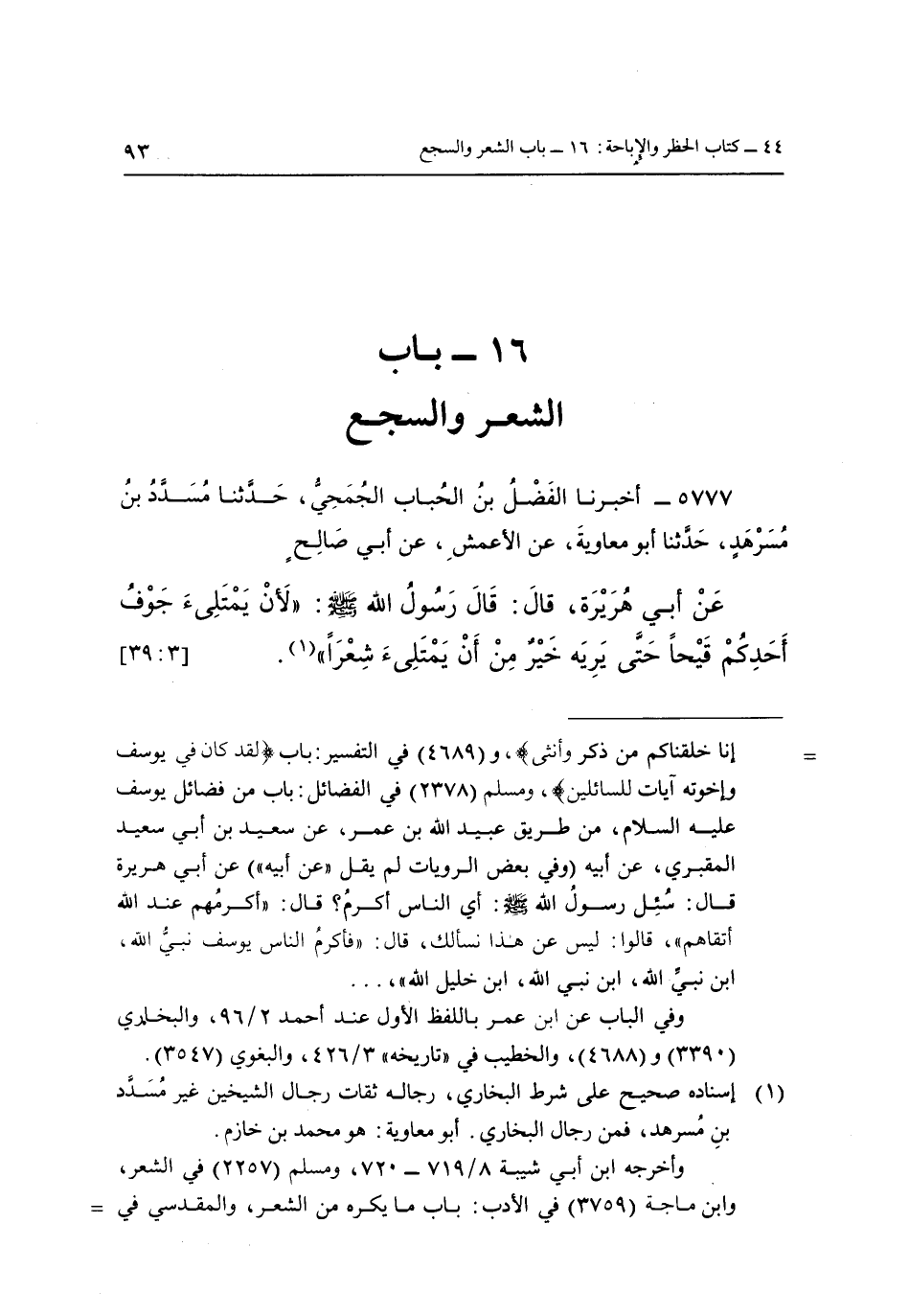 عَنْ أَبِي هُرَيْرَةَ، قَالَ: قَالَ رَسُولُ اللَّهِ صَلَّى اللَّهُ عَلَيْهِ وَسَلَّمَ: "لَأَنْ يَمْتَلِئَ جَوْفُ أَحَدِكُمْ قَيْحًا حَتَّى يَرِيَهُ خَيْرٌ مِنْ أَنْ يَمْتَلِئَ شعرا" 1 [39:3]