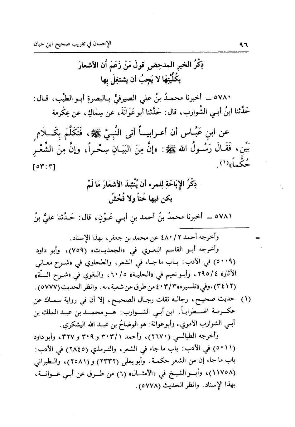 عن بن عَبَّاسٍ أَنَّ أَعْرَابِيًّا أَتَى النَّبِيَّ صَلَّى اللَّهُ عَلَيْهِ وَسَلَّمَ، فَتَكَلَّمَ بِكَلَامٍ بَيِّنٍ، فَقَالَ رَسُولُ اللَّهِ صَلَّى اللَّهُ عَلَيْهِ وَسَلَّمَ: "إِنَّ مِنَ البيان سحرا، وان من الشعر حكما" 1 [53:3]