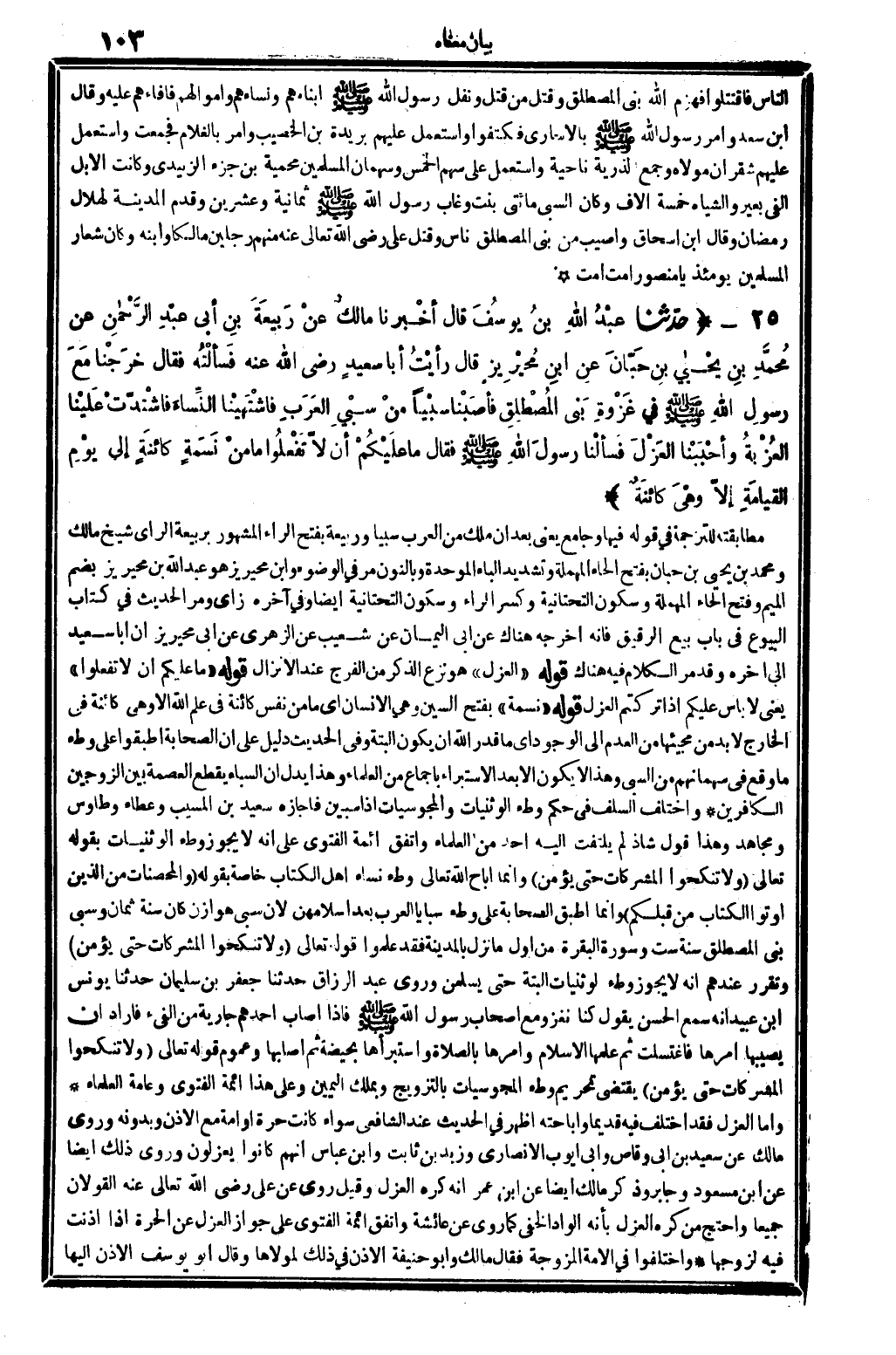 2452 - حدَّثنا عَبْدُ الله بنُ يُوسُفَ قَالَ أخبرنَا مَال عنْ رَبِيعَةَ بنِ أبِي عَبْدِ الرَّحْمانِ عَن مُحَمَّدِ بنِ يَحْياى بنِ حَبَّانَ عنِ ابنِ مُحَيْرِيزٍ قَالَ رأيْتُ أَبَا سعِيدٍ رَضِي الله تَعَالَى عنهُ فَسألْتُهُ فَقَالَ خرَجْنَا مَعَ رسولِ الله صلى الله عَلَيْهِ وَسلم فِي غَزْوَةِ بَنِي الْمُصْطَلِقِ فأصَبْنَا سبْياٍ مِنْ سَبْيِ الْعَرَبِ فاشْتَهَيْنَا النِّساءَ فاشْتَدَّتْ عَلَيْنَا العُزْبَةُ وأحْبَبْنا العَزْلَ فسَألْنا رسولَ الله صلى الله عَلَيْهِ وَسلم فَقَالَ مَا عَلَيْكُمْ أنْ لاَ تَفْعَلُوا مَا منْ نَسَمةٍ كائِنَةٍ إِلَى يَوْمِ القِيَامَةِ إلأ وهْيَ كائِنَةٌ..