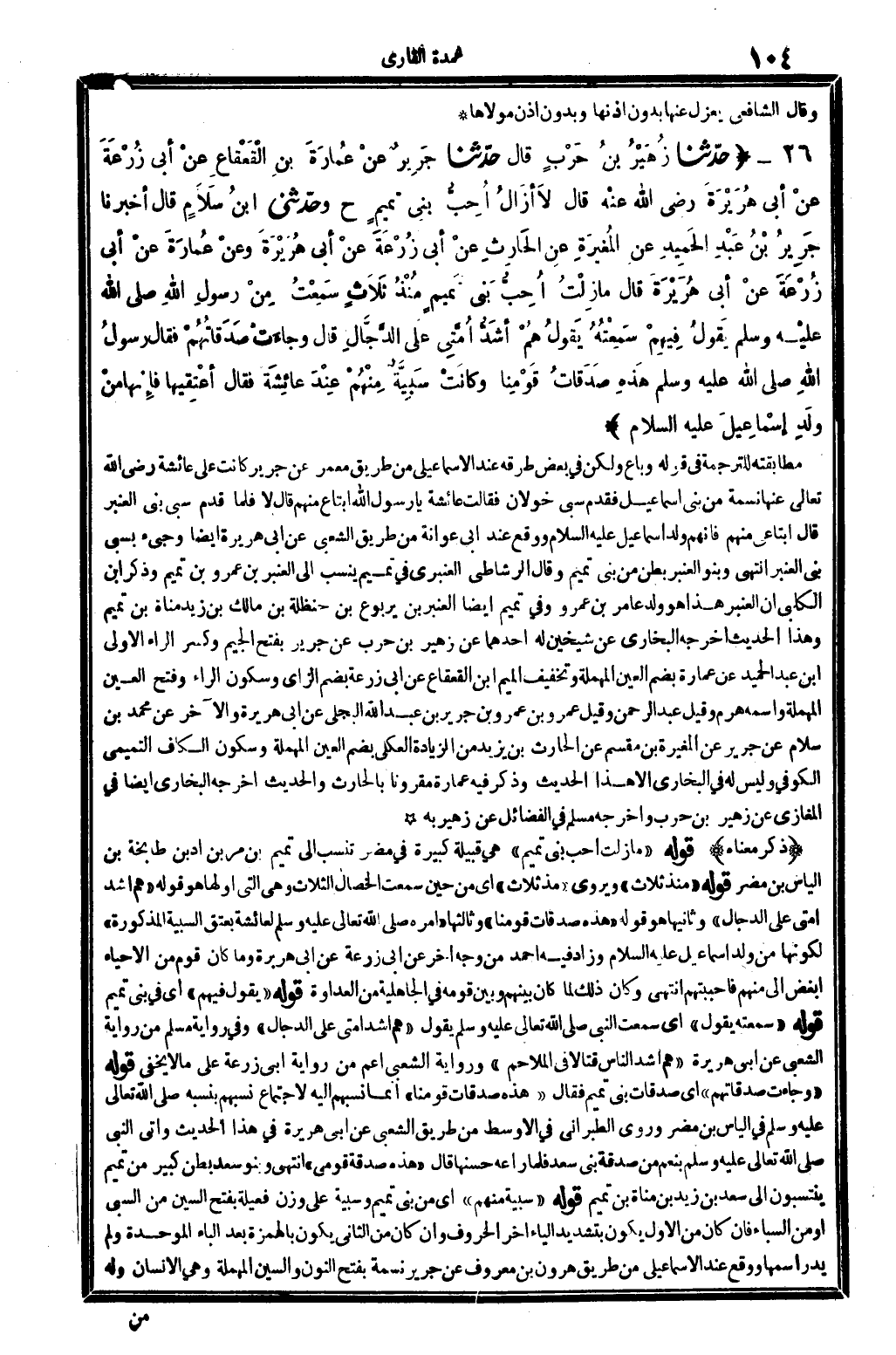 3452 - حدَّثنا زُهَيْرُ بنُ حَرْبٍ قَالَ حدَّثنا جَرِيرٌ عنْ عُمَارَةَ بنِ الْقَعْقَاعِ عنْ أبِي زُرْعَةَ عنْ أبِي هُرَيْرَةَ رَضِي الله تَعَالَى عنهُ قَالَ لَا أزَالُ أُحِبُّ بني تَمِيم ح وحدَّثني ابنُ سَلاَمٍ قَالَ أخبرنَا جَرِيرُ بنُ عَبْدِ الحَمِيدِ عنِ الْمُغِيرَةِ عنِ الحَارِثِ عنْ أبِي زُرْعَةَ عنْ أبِي هُرَيْرَةَ وعنْ عُمَارَةَ عنْ أبِي زُرْعَةَ عَن أبِي هُرَيْرَةَ قَالَ مَا زِلْتُ أُحِبُّ بَنِي تَمِيمٍ مُنْذُ ثَلاَثٍ سَمِعْتُ مِنْ رَسُول الله صلى الله عَلَيْهِ وَسلم يَقُولُ فِيهِمْ سَمِعْتُهُ يَقولُ هُمْ أشَدُّ أُمَّتِي على الدَّجَّالِ قَالَ وجاءَتْ صَدَقَاتُهُمْ فَقَالَ رسولُ الله صلى الله عَلَيْهِ وَسلم هَذهِ صَدَقَاتُ قَوْمِنا وكانَتْ سَبِيَّةٌ منْهُمْ عِنْدَ عائِشَةَ فَقَالَ أعْتِقِيها فإنَّها منْ وَلَدِ إسْمَاعِيلَ عليهِ السَّلامُ.