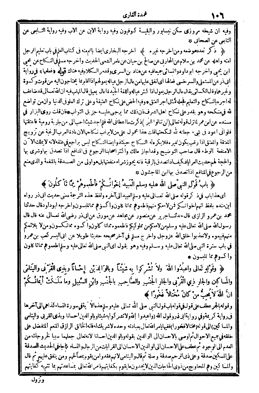 وَقَوله، بِالْجَرِّ عطف على: قَول، فِي قَوْله: بَاب قَول النَّبِي صلى الله عَلَيْهِ وَسلم، هَذِه الْآيَة فِي سُورَة النِّسَاء، كَذَا هِيَ إِلَى آخرهَا فِي رِوَايَة كَرِيمَة، وَفِي رِوَايَة أبي ذَر: وَقَول الله: {واعبدوا الله وَلَا تُشْرِكُوا بِهِ شَيْئا وبالوالدين إحساناً وبذي الْقُرْبَى واليتامى وَالْمَسَاكِين} إِلَى قَوْله: {مختالاً فخوراً} (النِّسَاء: 63) . فَفِيهَا يَأْمر الله تَعَالَى بِعِبَادَتِهِ وَحده لَا شريك لَهُ، فَإِنَّهُ الخالف الرازق الْمُنعم المتفضل على خلقه فِي جَمِيع الْأَحْوَال، ثمَّ أوصى بِالْإِحْسَانِ إِلَى الْوَالِدين بقوله: {وبالوالدين إحسانا} (النِّسَاء: 63) . لِأَنَّهُ تَعَالَى جَعلهمَا سَببا لخروجك من الْعَدَم إِلَى الْوُجُود، ثمَّ عطف على الْإِحْسَان إِلَى الْوَالِدين الْإِحْسَان إِلَى الْقرَابَات من الرِّجَال وَالنِّسَاء، كَمَا جَاءَ فِي الحَدِيث: الصَّدَقَة على الْمِسْكِين صَدَقَة، وعَلى ذِي الرَّحِم صَدَقَة، وَصله. ثمَّ قَالَ: واليتامى، لأَنهم فقدوا من يقوم بمصالحهم، وَمن ينْفق عَلَيْهِم؟ ثمَّ قَالَ: وَالْمَسَاكِين: وهم المحاويج من ذَوي الْحَاجَات الَّذين لَا يَجدونَ مَا يقوم بكفايتهم، فَأمر الله تَعَالَى بمساعدتهم بِمَا تتمّ بِهِ كفايتهم: