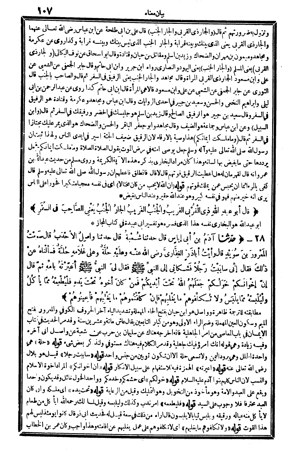 وتزول بِهِ ضرورتهم، ثمَّ قَالَ: {وَالْجَار ذِي الْقُرْبَى وَالْجَار الْجنب} (النِّسَاء: 63) . قَالَ عَليّ بن أبي طَلْحَة عَن ابْن عَبَّاس رَضِي الله تَعَالَى عَنْهُمَا وَالْجَار ذِي القربي، يَعْنِي: الَّذِي بَيْنك وَبَينه قرَابَة، وَالْجَار الْجنب: الَّذِي لَيْسَ بَيْنك وَبَينه قرَابَة، وَكَذَا رُوِيَ عَن عِكْرِمَة وَمُجاهد وَمَيْمُون بن مهْرَان وَالضَّحَّاك وَزيد بن أسلم وَمُقَاتِل بن حَيَّان وَقَتَادَة، وَقَالَ أَبُو إِسْحَاق عَن نوف الْبكالِي {وَالْجَار ذِي الْقُرْبَى} (النِّسَاء: 63) . يَعْنِي: الْمُسلم. {وَالْجَار الْجنب} (النِّسَاء: 63) . يَعْنِي: الْيَهُودِيّ والنصاري، رَوَاهُ ابْن جرير وَابْن أبي حَاتِم. وَقَالَ جَابر الْجعْفِيّ عَن الشّعبِيّ عَن عَليّ وَابْن مَسْعُود: {الْجَار ذِي الْقُرْبَى} (النِّسَاء: 63) . الْمَرْأَة، وَقَالَ مُجَاهِد: {وَالْجَار الْجنب} (النِّسَاء: 63) . يَعْنِي: الرفيق فِي السّفر. ثمَّ قَالَ: والصاحب بالجنب، قَالَ الثَّوْريّ عَن جَابر الْجعْفِيّ عَن الشّعبِيّ عَن عَليّ وَابْن مَسْعُود، قَالَا: هِيَ الْمَرْأَة، قَالَ ابْن أبي حَاتِم: كَذَا رُوِيَ عَن عبد الرَّحْمَن بن أبي ليلى وَإِبْرَاهِيم النَّخعِيّ وَالْحسن وَسَعِيد بن جُبَير فِي إِحْدَى الرِّوَايَات. وَقَالَ ابْن عَبَّاس وَمُجاهد وَعِكْرِمَة وَقَتَادَة: هُوَ الرفيق فِي السّفر، وَقَالَ سعيد بن جُبَير: هُوَ الرفيق الصَّالح، وَقَالَ زيد بن أسلم: هُوَ جليسك فِي الْحَضَر ورفيقك فِي السّفر، ثمَّ قَالَ: {وَابْن السَّبِيل} (النِّسَاء: 63) . وَعَن ابْن عَبَّاس وَجَمَاعَة: هُوَ الضَّيْف، وَقَالَ مُجَاهِد وَأَبُو جَعْفَر الباقر وَالْحسن وَالضَّحَّاك: هُوَ الَّذِي يمر عَلَيْك مجتازاً فِي السّفر. ثمَّ قَالَ: {وَمَا ملكت أَيْمَانكُم} (النِّسَاء: 63) . هَذَا وَصِيَّة بالأرقاء، لِأَن الرَّقِيق ضَعِيف الجثة أَسِير فِي أَيدي النَّاس، وَلِهَذَا ثَبت أَن رَسُول الله صلى الله عَلَيْهِ وَسلم، جعل يُوصي أمته فِي مرض الْمَوْت يَقُول: الصَّلَاة الصَّلَاة وَمَا ملكت إيمَانكُمْ، فَجعل يُرَدِّدهَا حَتَّى مَا يفِيض بهَا لِسَانه، وَهَذَا كَانَ مُرَاد البُخَارِيّ بِذكرِهِ هَذِه الْآيَة الْكَرِيمَة، وروى مُسلم من حَدِيث عبد الله بن عَمْرو أَنه قَالَ لقهرمان لَهُ: هَل أَعْطَيْت الرَّقِيق قوتهم؟ قَالَ: لَا. قَالَ: فَانْطَلق فأعطهم، إِن رَسُول الله صلى الله عَلَيْهِ وَسلم، قَالَ: كفى بِالْمَرْءِ إِثْمًا أَن يحبس عَمَّن يملك قوتهم. قَوْله: {إِن الله لَا يحب من كَانَ مختالاً} (النِّسَاء: 63) . أَي: فِي نَفسه معجباً متكبراً {فخوراً} (النِّسَاء: 63) . على النَّاس، يرى أَنه خير مِنْهُم، فَهُوَ فِي نَفسه كَبِير، وَهُوَ عِنْد الله حقير وَعند النَّاس بغيض.
