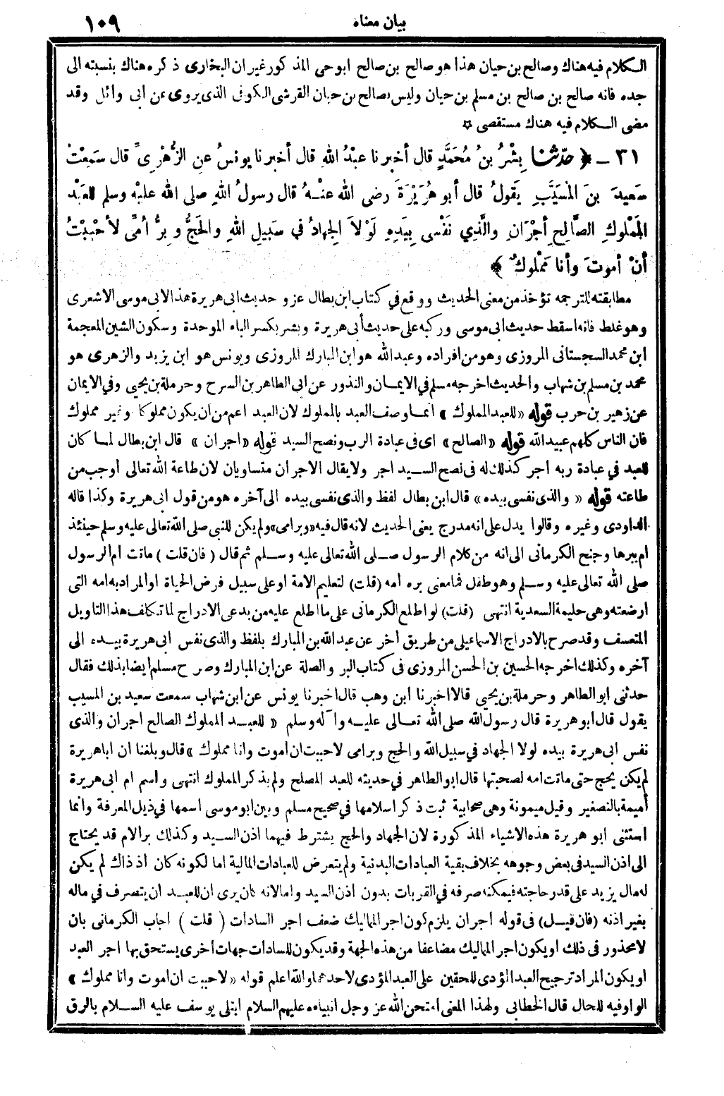 قَوْله: (للْعَبد الْمَمْلُوك) إِنَّمَا وصف العَبْد بالمملوك، لِأَن العَبْد أَعم من أَن يكون مَمْلُوكا وَغير مَمْلُوك، فَإِن النَّاس كلهم عبيد الله. قَوْله: (الصَّالح) ، أَي: فِي عبَادَة الرب ونصح السَّيِّد. قَوْله: (أَجْرَانِ) ، قَالَ ابْن بطال: لما كَانَ للْعَبد فِي عبَادَة ربه أجر، كَذَلِك لَهُ فِي نصح السَّيِّد أجر، وَلَا يُقَال: الأجران متساويان، لِأَن طَاعَة الله تَعَالَى أوجب من طَاعَته. قَوْله: (وَالَّذِي نَفسِي بِيَدِهِ) ، قَالَ ابْن بطال: لفظ: (وَالَّذِي نَفسِي بِيَدِهِ. .) إِلَى آخِره هُوَ من قَول أبي هُرَيْرَة، وَكَذَا قَالَه الدَّاودِيّ وَغَيره، وَقَالُوا: يدل على أَنه مدرج يَعْنِي: الحَدِيث لِأَنَّهُ قَالَ فِيهِ: (وبرُّ أُمِّي) ، وَلم يكن للنَّبِي، صلى الله عَلَيْهِ وَسلم، حِينَئِذٍ أم يبرها، وجنح الْكرْمَانِي إِلَى أَنه من كَلَام الرَّسُول، صلى الله عَلَيْهِ وَسلم. ثمَّ قَالَ: فَإِن قلت: مَاتَ أم الرَّسُول، صلى الله عَلَيْهِ وَسلم، وَهُوَ طِفْل، فَمَا معمى بره أمه؟ قلت: لتعليم الْأمة، أَو على سَبِيل فرض الْحَيَاة، أَو المُرَاد بِهِ أمه الَّتِي أَرْضَعَتْه، وَهِي حليمة السعدية. انْتهى. قلت: لَو اطلع الْكرْمَانِي على مَا اطلع عَلَيْهِ من يَدعِي الإدراج لما تكلّف هَذَا التَّأْوِيل المتعسف، وَقد صرح بالإدراج الْإِسْمَاعِيلِيّ من طَرِيق آخر عَن عبد الله بن الْمُبَارك بِلَفْظ: وَالَّذِي نفس أبي هُرَيْرَة بِيَدِهِ ... إِلَى آخِره، وَكَذَلِكَ أخرجه الْحُسَيْن بن الْحسن الْمروزِي فِي كتاب (الْبر والصلة) عَن ابْن الْمُبَارك، وَصرح مُسلم أَيْضا بذلك، فَقَالَ: حَدثنِي أَبُو الطَّاهِر وحرملة بن يحيى، قَالَا: أخبرنَا ابْن وهب، قَالَ: أخبرنَا يُونُس عَن ابْن شهَاب، سَمِعت سعيد بن الْمسيب يَقُول: قَالَ أَبُو هُرَيْرَة: قَالَ رَسُول الله صلى الله عَلَيْهِ وَسلم: (للْعَبد الْمَمْلُوك الصَّالح أَجْرَانِ، وَالَّذِي نفس أبي هُرَيْرَة بِيَدِهِ، لَوْلَا الْجِهَاد فِي سَبِيل الله، وَالْحج وبر أُمِّي لأحببت أَن أَمُوت وَأَنا مَمْلُوك) . قَالَ: وبلغنا أَن أَبَا هُرَيْرَة لم يكن يحجّ حَتَّى مَاتَت أمه لصحبتها، قَالَ أَبُو الطَّاهِر: فِي حَدِيثه (للْعَبد المصلح) وَلم يذكر الْمَمْلُوك. انْتهى. وَاسم أم أبي هُرَيْرَة: أُمَيْمَة، بِالتَّصْغِيرِ، وَقيل: مَيْمُونَة، وَهِي صحابية ثَبت ذكر إسْلَامهَا فِي (صَحِيح مُسلم) وَبَين أَبُو مُوسَى اسْمهَا فِي ذيل (الْمعرفَة) ، وإنمااستثنى أَبُو هُرَيْرَة هَذِه الْأَشْيَاء الْمَذْكُورَة لِأَن الْجِهَاد وَالْحج يشْتَرط فيهمَا إِذن السَّيِّد، وَكَذَلِكَ بر الْأُم، قد يحْتَاج إِلَى إِذن السَّيِّد فِي بعض وجوهه، بِخِلَاف بَقِيَّة الْعِبَادَات الْبَدَنِيَّة، وَلم يتَعَرَّض للعبادات الْمَالِيَّة إِمَّا لكَونه كَانَ إِذْ ذَاك لم يكن لَهُ مَال يزِيد على قدر حَاجته فيمكنه صرفه فِي القربات بِدُونِ إِذن السَّيِّد، وَإِمَّا لِأَنَّهُ كَانَ يرى أَن للْعَبد أَن يتَصَرَّف فِي مَاله بِغَيْر إِذْنه. فَإِن قيل: فِي قَوْله: أَجْرَانِ، يلْزم كَون أجر المماليك ضعف أجر السادات؟ قلت: أجَاب الْكرْمَانِي: بِأَن لَا مَحْذُور فِي ذَلِك، أَو يكون أجر المماليك مضاعفاً من هَذِه الْجِهَة، وَقد يكون للسادات جِهَات أُخْرَى يسْتَحق بهَا أجر العَبْد، أَو يكون المُرَاد تَرْجِيح العَبْد الْمُؤَدِّي للحقين على العَبْد الْمُؤَدِّي لأَحَدهمَا. وَالله أعلم. قَوْله: (لأحببت أَن أَمُوت وَأَنا مَمْلُوك) ، الْوَاو، فِيهِ للْحَال. قَالَ الْخطابِيّ: وَلِهَذَا الْمَعْنى امتحن الله، عز وَجل، أنبياءه، عَلَيْهِم السَّلَام، ابتلى يُوسُف، عَلَيْهِ السَّلَام، بِالرّقِّ
