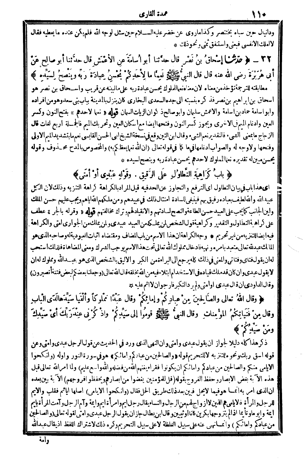 ذكر هَذَا كُله دَلِيلا لجَوَاز أَن يَقُول: عَبدِي وَأمتِي، وَأَن النَّهْي الَّذِي ورد فِي الحَدِيث عَن قَول الرجل: عَبدِي وَأمتِي. وَعَن قَوْله: إسق ربَّكَ، وَنَحْوه للتنزيه لَا للتَّحْرِيم. قَوْله: {وَالصَّالِحِينَ من بادكم وَإِمَائِكُمْ} هُوَ فِي سُورَة النُّور، وأوله: {وَانْكِحُوا الْأَيَامَى مِنْكُم وَالصَّالِحِينَ من عبادكُمْ وَإِمَائِكُمْ إِن يَكُونُوا فُقَرَاء يُغْنِهِم الله من فَضله وَالله وَاسع عليم} (النُّور: 23) . وَلما أَمر الله تَعَالَى قبل هَذِه الْآيَة بغض الْأَبْصَار وَحفظ الْفروج، بقوله: {قل للْمُؤْمِنين يغضوا من أَبْصَارهم ويحفظوا فروجهم} (النِّسَاء: 52) . الْآيَة، بَين بعده أَن الَّذِي أَمر بِهِ إِنَّمَا هُوَ فِيمَا لَا يحل، فَبين بعد ذَلِك طَرِيق الْحل، فَقَالَ: {وَأنْكحُوا الْأَيَامَى} (النُّور: 23) . أَصْلهَا: أيائم، فَقلب، والأيم للرجل وَالْمَرْأَة، فالأيامي: هم الَّذين لَا أَزوَاج لَهُم من الرِّجَال وَالنِّسَاء، يُقَال: رجل أيم وَامْرَأَة إيم وأيمة. وآم الرجل وآمت الْمَرْأَة بأيم أيمة، وأيوماً إِذا لم يتزوجا بكرين كَانَا أَو ثيبين، وَقَالَ ابْن بطال: جَازَ أَن يَقُول الرجل: عَبدِي وَأمتِي، لقَوْله تَعَالَى: {وَالصَّالِحِينَ من عبادكُمْ وَإِمَائِكُمْ} (النُّور: 23) . وَإِنَّمَا نهى عَنهُ على سَبِيل الغلظة لَا على سَبِيل التَّحْرِيم، وَكره ذَلِك لاشْتِرَاط اللَّفْظ، إِذْ يُقَال: عبد الله