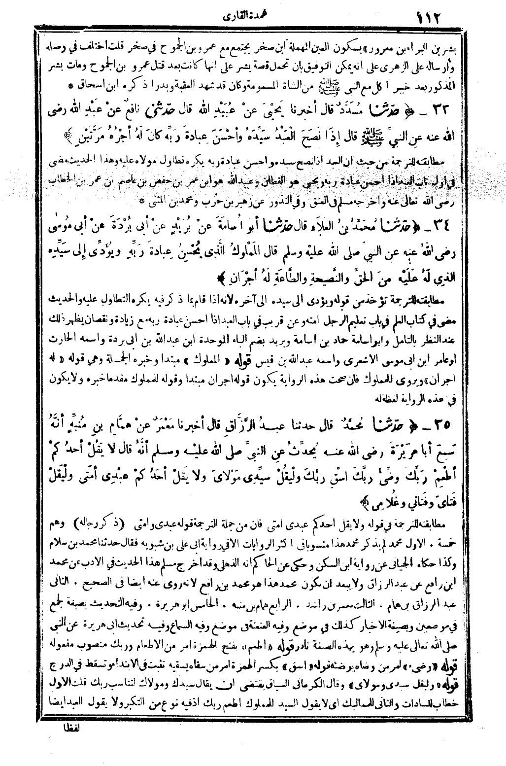 1552 - حدَّثنا مُحَمَّدُ بنُ العَلاَءِ قَالَ حدَّثنا أَبُو أُسَامَةَ عنْ بُرَيْدٍ عنْ أبِي بُرْدَةَ عنْ أبِي مُوساى رَضِي الله تَعَالَى عنهُ عنِ النَّبِيِّ صلى الله عَلَيْهِ وَسلم قَالَ الْمَمْلُوكُ الَّذِي يُحْسِنُ عِبَادَةَ رَبِّهِ ويُؤَدِّي إلَى سَيِّدِهِ الَّذِي لَهُ عَلَيْهِ مِنَ الحَقِّ والنَّصِيحَةِ والطَّاعَةِ لَهُ أجْرَانِ..