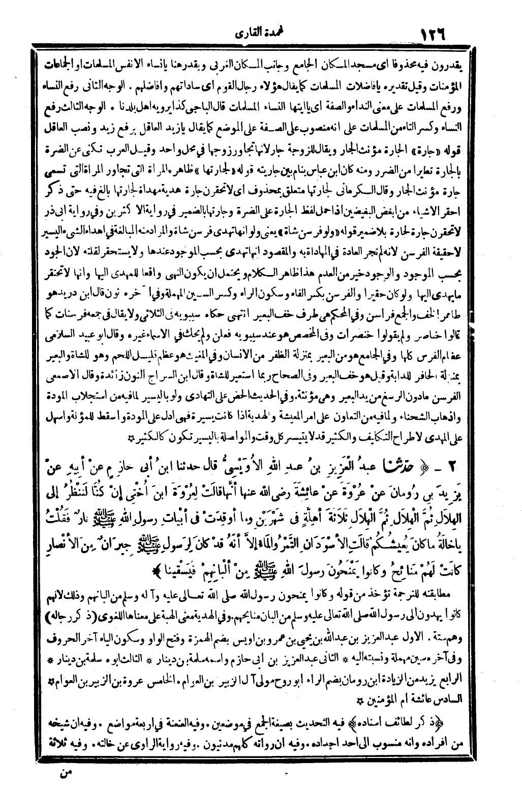 2 - (حَدثنَا عبد الْعَزِيز بن عبد الله الأويسي قَالَ حَدثنَا ابْن أبي حَازِم عَن أَبِيه عَن يزِيد بن رُومَان عَن عُرْوَة عَن عَائِشَة رَضِي الله عَنْهَا أَنَّهَا قَالَت لعروة ابْن أُخْتِي إِن كُنَّا لنَنْظُر إِلَى الْهلَال ثمَّ الْهلَال ثمَّ الْهلَال ثَلَاثَة أهلة فِي شَهْرَيْن وَمَا أوقدت فِي أَبْيَات رَسُول الله - صَلَّى اللَّهُ عَلَيْهِ وَسَلَّم َ - نَار فَقلت يَا خَالَة مَا كَانَ يعيشكم قَالَت الأسودان التَّمْر وَالْمَاء إِلَّا أَنه قد كَانَ لرَسُول الله - صَلَّى اللَّهُ عَلَيْهِ وَسَلَّم َ - جيران من الْأَنْصَار كَانَت لَهُم منائح وَكَانُوا يمنحون رَسُول الله - صَلَّى اللَّهُ عَلَيْهِ وَسَلَّم َ - من ألبانهم فيسقينا) مطابقته للتَّرْجَمَة تُؤْخَذ من قَوْله وَكَانُوا يمنحون رَسُول الله - صَلَّى اللَّهُ عَلَيْهِ وَسَلَّم َ - من ألبانهم وَذَلِكَ لأَنهم كَانُوا يهْدُونَ إِلَى رَسُول الله - صَلَّى اللَّهُ عَلَيْهِ وَسَلَّم َ - من ألبان منايحهم. وَفِي الْهَدِيَّة معنى الْهِبَة على مَعْنَاهَا اللّغَوِيّ. (ذكر رِجَاله) وهم سِتَّة. الأول عبد الْعَزِيز بن عبد الله بن يحيى بن عَمْرو بن أويس بِضَم الْهمزَة وَفتح الْوَاو وَسُكُون الْيَاء آخر الْحُرُوف وَفِي آخِره سين مُهْملَة ونسبته إِلَيْهِ. الثَّانِي عبد الْعَزِيز بن أبي حَازِم واسْمه سَلمَة بن دِينَار. الثَّالِث أَبوهُ سَلمَة بن دِينَار. الرَّابِع يزِيد من الزِّيَادَة ابْن رُومَان بِضَم الرَّاء أَبُو روح مولى آل الزبير بن الْعَوام. الْخَامِس عُرْوَة بن الزبير بن الْعَوام. السَّادِس عَائِشَة أم الْمُؤمنِينَ. (ذكر لطائف إِسْنَاده) فِيهِ التحديث بِصِيغَة الْجمع فِي موضِعين. وَفِيه العنعنة فِي أَرْبَعَة مَوَاضِع. وَفِيه أَن شَيْخه من أَفْرَاده وَأَنه مَنْسُوب إِلَى أحد أجداده. وَفِيه أَن رُوَاته كلهم مدنيون. وَفِيه رِوَايَة الرَّاوِي عَن خَالَته. وَفِيه ثَلَاثَة