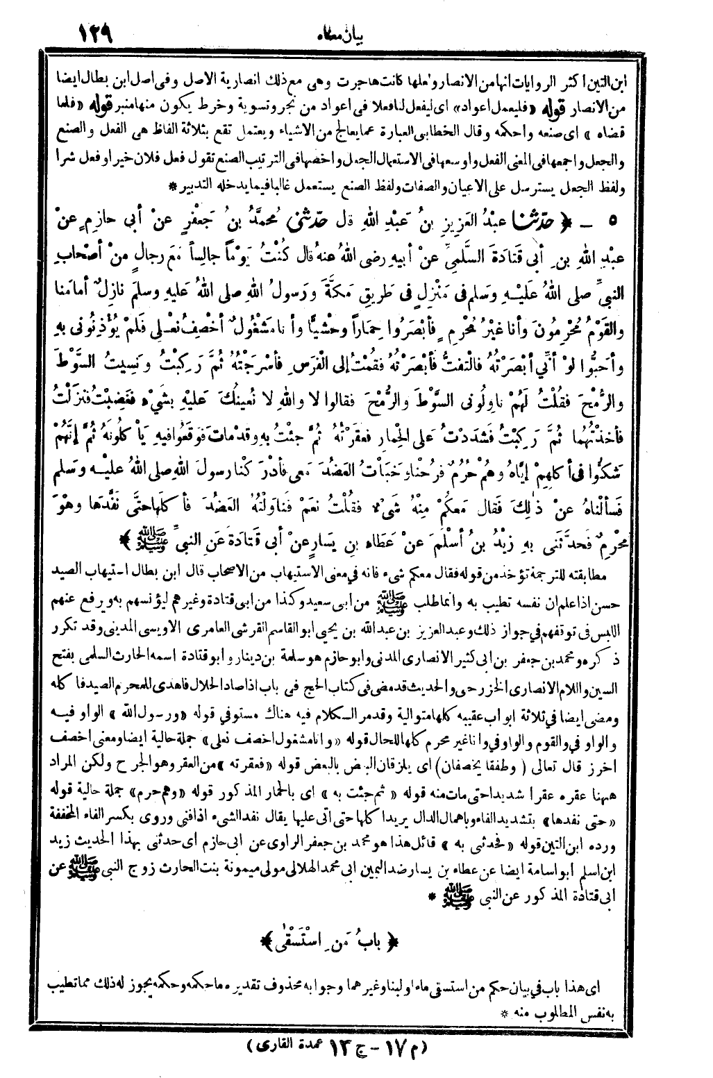 0752 - حدَّثنا عبْدُ العَزِيزِ بنُ عَبْدِ الله قَالَ حدَّثني مُحَمَّدُ بنُ جَعْفَرٍ عنْ أبِي حازِمٍ عنْ عَبْدِ الله بنِ أبِي قَتَادَةَ السَّلَمِيِّ عنْ أبيهِ رَضِي الله تَعَالَى عَنهُ قَالَ كُنْتُ يَوْماً جالِساً مَعَ رِجالٍ منْ أصْحابِ النبيِّ صلى الله عَلَيْهِ وَسلم فِي مَنْزِلٍ فِي طَريقِ مَكَّةَ ورسولُ الله صلى الله عَلَيْهِ وَسلم نازِلٌ أمامَنا والقَوْمُ مُحْرِمُونَ وأنَا غَيرْرُ مُحْرِمٍ فأبْصَرُوا حِمَاراً وحْشياً وَأَنا مَشْغُولٌ أخْصِفُ نعلِي فَلَمْ يُؤْذُونِي بِهِ وأحَبُّو لوْ أنِّي أبْصَرْتُهُ فالْتَفَتُّ فأبْصَرْتُهُ فقُمْتُ إلاى الفَرَسِ فأسْرَجْتُهُ ثُمَّ رَكِبْتُ ونَسِيتُ السَّوْطَ والرُّمْحَ فَقُلْتُ لَهُمْ ناوِلُونِي السَّوْطَ والرُّمْحَ فَقَالُوا لَا وَالله لَا نُعِينُكَ علَيْهِ بِشَيْءٍ فغَضِبْتُ فنَزَلْتُ فأخَذْتُهُما ثُمَّ رَكِبْتُ فَشَدَدْتُ علَى الحِمَارِ فَعَقَرْتُهُ ثُمَّ جِئْتُ بِهِ وقدْ ماتَ فَوَقَعُوا فِيهِ يأكُلُونَهُ ثُمَّ إنَّهُمْ شَكُّوا فِي أكْلِهِمْ إيَّاهُ وهُمْ حُرُمٌ فرُحْنَا وخَبَاتُ العَضُدَ مَعي فأدْرَكْنا رسولَ الله صلى الله عَلَيْهِ وَسلم فَسَألْناهُ عنْ ذالِكَ فَقال معَكُمْ مِنْهُ شَيْءٌ فقُلْتُ نَعَمْ فَنَاوَلْتُهُ العَضُدَ فأكَلَهَا حتَّى نَفَّدَهَا وهْوَ مُحْرِمٌ فحدَّثنِي بِهِ زيْدُ بنُ أسْلَمَ عنْ عَطَاءِ بنِ يَسارٍ عنْ أبِي قَتادَةَ عنِ النبيِّ صلى الله عَلَيْهِ وَسلم..