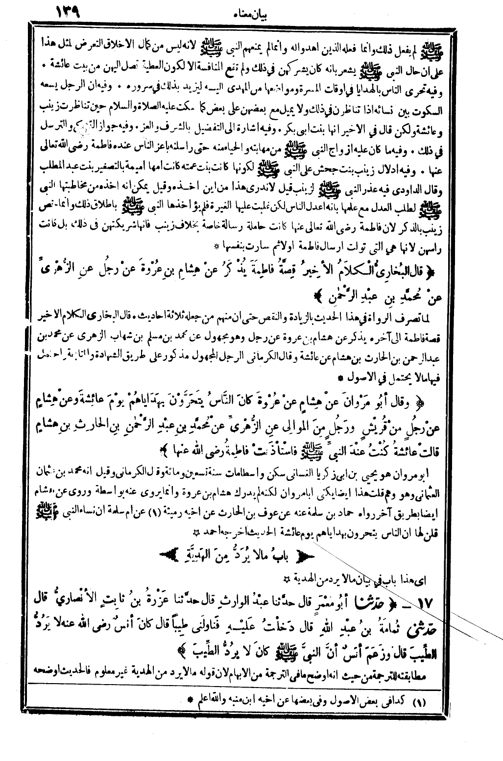 قَالَ البُخَارُيُّ الْكَلامُ الأخِيرُ قَصَّةُ فاطِمَةَ يُذْكَرُ عنْ هِشَامِ بنِ عُرْوَةَ عنْ رَجُل عنِ الزُّهْرِيَّ عنْ مُحَمَّدِ بنِ عَبْدِ الرَّحْمانِ