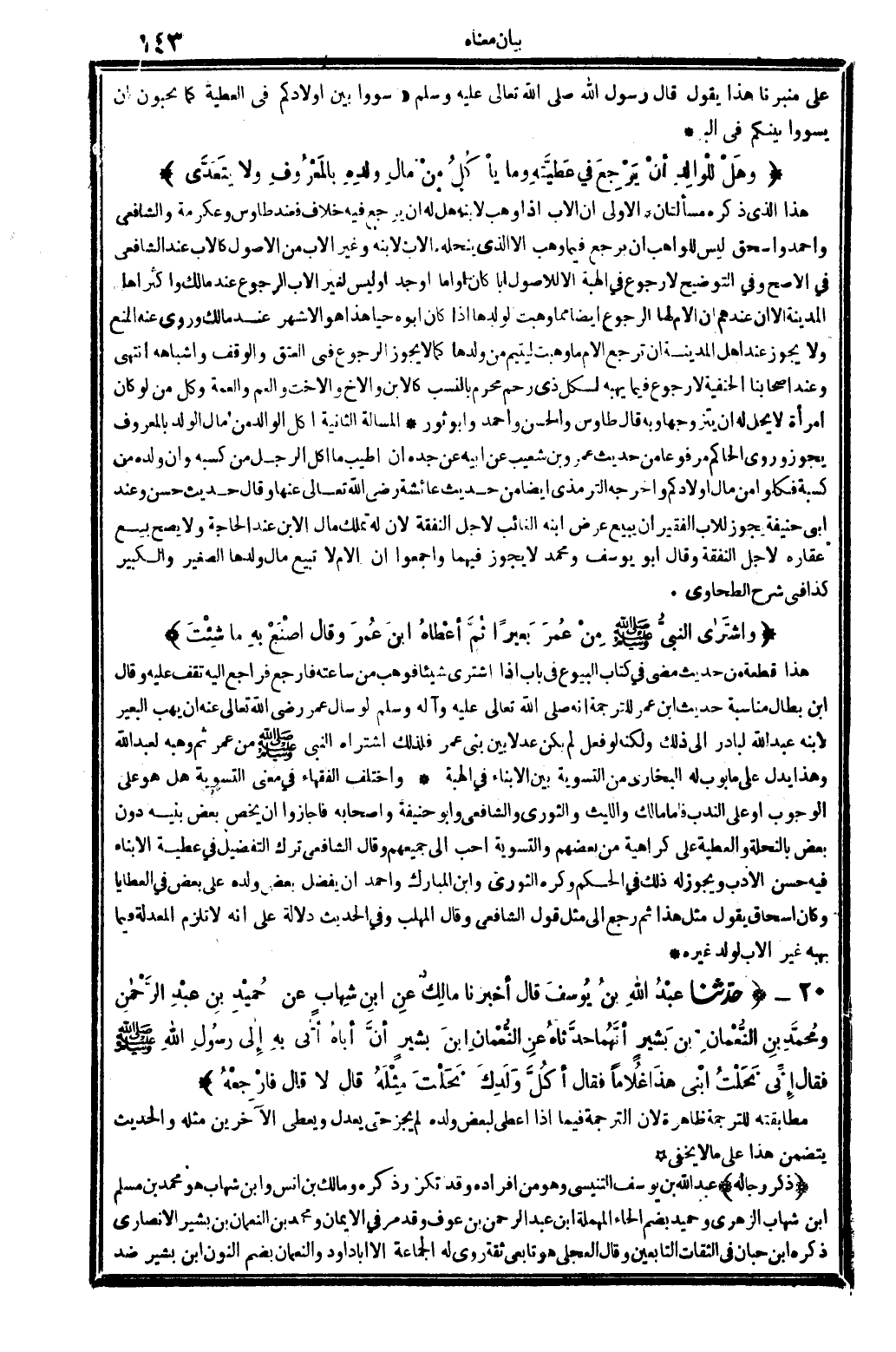 وَاخْتلف الْفُقَهَاء فِي معنى التَّسْوِيَة: هَل هُوَ على الْوُجُوب أَو على النّدب؟ فَأَما مَالك وَاللَّيْث وَالثَّوْري وَالشَّافِعِيّ وَأَبُو حنيفَة وَأَصْحَابه فأجازوا أَن يخص بعض بنيه دون بعض بالنحلة والعطية، على كَرَاهِيَة من بَعضهم، والتسوية أحب إِلَى جَمِيعهم. وَقَالَ الشَّافِعِي: ترك التَّفْضِيل فِي عَطِيَّة الْأَبْنَاء فِيهِ حسن الْأَدَب، وَيجوز لَهُ ذَلِك فِي الحكم، وَكره الثَّوْريّ وَابْن الْمُبَارك وَأحمد أَن يفضل بعض وَلَده على بعض فِي العطايا، وَكَانَ إِسْحَاق يَقُول مثل هَذَا، ثمَّ رَجَعَ إِلَى مثل قَول الشَّافِعِي. وَقَالَ الْمُهلب: وَفِي الحَدِيث دلَالَة على أَنه لَا تلْزم المعدلة فِيمَا يَهبهُ غير الْأَب لولد غَيره.
