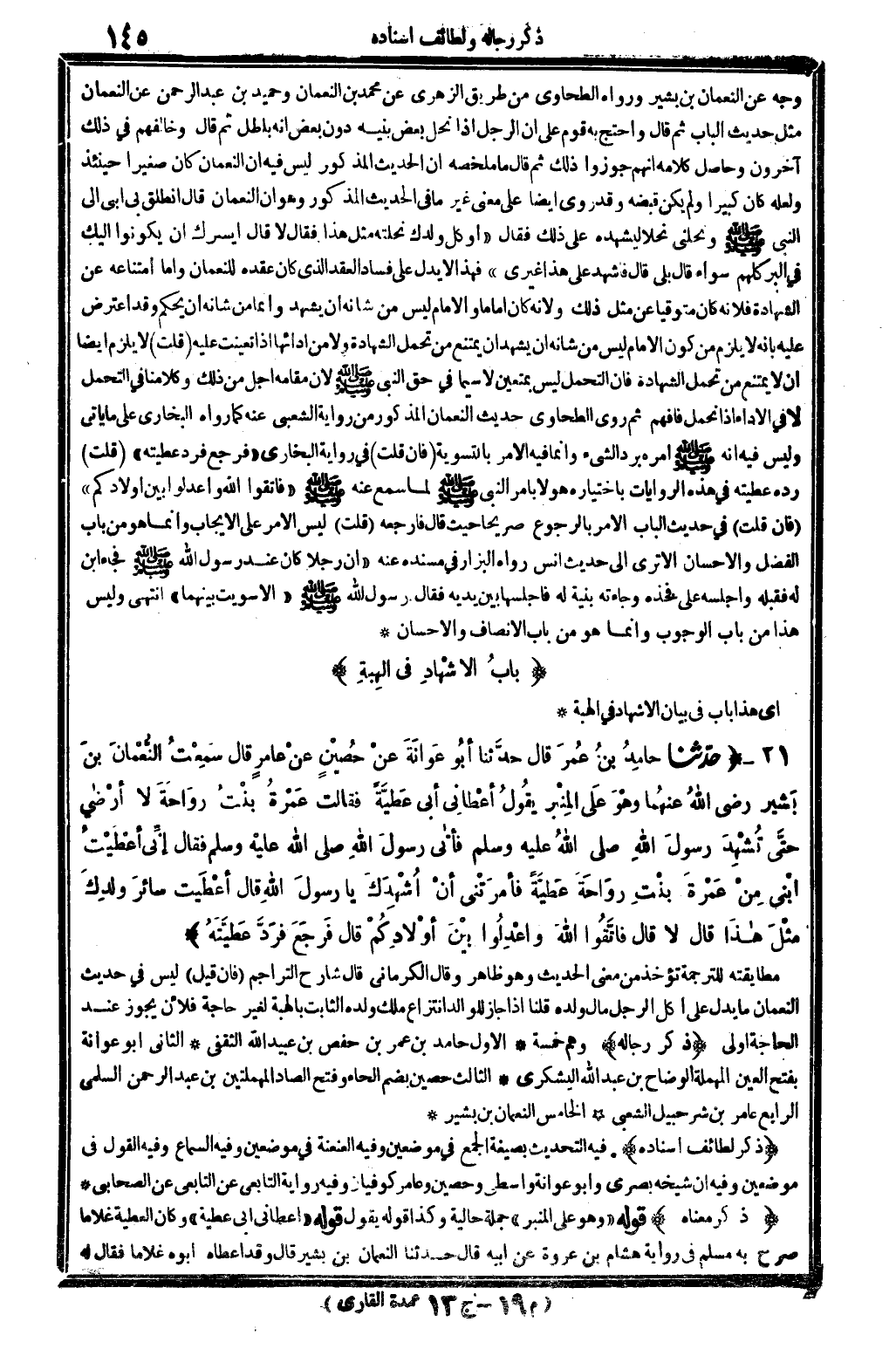 ذكر رِجَاله وهم خَمْسَة: الأول: حَامِد بن عمر بن حَفْص بن عبيد الله الثَّقَفِيّ. الثَّانِي: أَبُو عوَانَة، بِفَتْح الْعين الْمُهْملَة: الوضاح بن عبد الله الْيَشْكُرِي. الثَّالِث: حُصَيْن، بِضَم الْحَاء وَفتح الصَّاد الْمُهْمَلَتَيْنِ: ابْن عبد الرَّحْمَن السّلمِيّ. الرَّابِع: عَامر بن شُرَحْبِيل الشّعبِيّ. الْخَامِس: النُّعْمَان بن بشير.