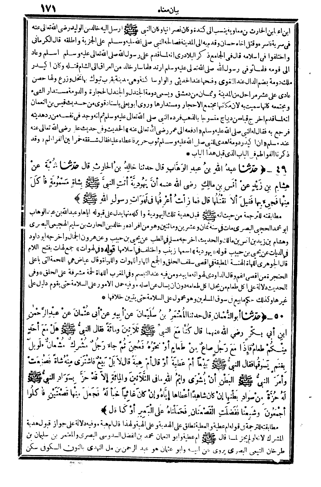 8162 - حدَّثنا أَبُو النُّعْمانِ قَالَ حدَّثنا الْمُعْتَمِرُ بنُ سُلَيْمَانَ عنْ أبِيهِ عنْ أبِي عُثْمَان عَن عبد الرَّحْمانِ ابنِ أبِي بَكْرٍ رَضِي الله تَعَالَى عنهُما قَالَ كُنَّا مَعَ النَّبيِّ صلى الله عَلَيْهِ وَسلم ثَلاثِينَ ومائَةً فَقَالَ النبيُّ صلى الله عَلَيْهِ وَسلم هَلْ مَعَ أحَدٍ مِنْكُمْ طعامٌ فإذَا مَعَ رَجُلٍ صاعٌ مِنْ طَعَامٍ أوْ نَحْوُهُ فَعُجِنَ ثُمَّ جاءَ رَجُلٌ مُشْرِكٌ مُشْعَانُّ طَوِيلٌ بِغَنَمٍ يَسُوقُها فَقَالَ النبيُّ صلى الله عَلَيْهِ وَسلم بَيْعَاً أمْ عَطِيَّةٌ أوْ قالَ هِبَةً قَالَ لاَ بَلْ بَيْعٌ فاشْتَرَى مِنْهُ شَاة فَصُنِعَتْ وأمَرَ النبيُّ صلى الله عَلَيْهِ وَسلم البَطْنَ أنْ يُشْوَى وايْمُ الله مَا فِي الثَّلاثِينَ والمِائَةِ إلاَّ قَدْ حَزَّ بِسَوادِ النبيُّ صلى الله عَلَيْهِ وَسلم لَهُ حُزَّةً مِنْ سَوادِ بَطْنِهَا إنْ كانَ شاهِداً أعْطَاهَا إيَّاهُ وإنْ كانَ غائِباً خَبَّأ لَهُ فَجَعَلَ مِنْهَا قَصْعَتَيْنِ فأكَلُوا أجْمَعُونَ وشَبِعْنَا فَفُضِلَتِ الْقَصْعَتَانِ فَحَمَلْناهُ على البَعِيرِ أوْ كَما قَالَ..