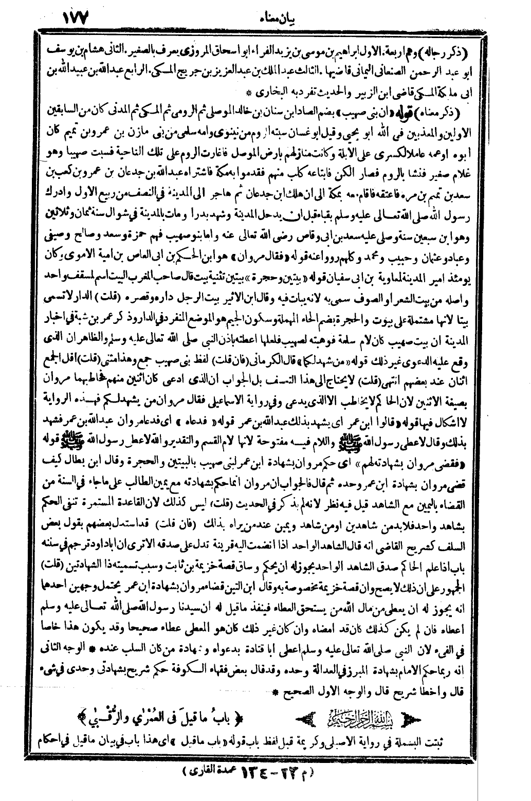 وَقَالَ ابْن بطال: كَيفَ قضى مَرْوَان بِشَهَادَة ابْن عمر وَحده؟ ثمَّ قَالَ: فَالْجَوَاب: أَن مَرْوَان إِنَّمَا حكم بِشَهَادَتِهِ مَعَ يَمِين الطَّالِب، على مَا جَاءَ فِي السّنة من الْقَضَاء بِالْيَمِينِ مَعَ الشَّاهِد، قيل: فِيهِ نظر، لِأَنَّهُ لم يذكر فِي الحَدِيث. قلت: لَيْسَ كَذَلِك لِأَن الْقَاعِدَة المستمرة تَنْفِي الحكم بِشَاهِد وَاحِد. فَلَا بُد من شَاهِدين أَو من شَاهد وَيَمِين عِنْد من يرَاهُ بذلك. فَإِن قلت: قد اسْتدلَّ بَعضهم بقول بعض السّلف، كشريح القَاضِي، أَنه قَالَ: الشَّاهِد الْوَاحِد إِذا انضمت إِلَيْهِ قرينَة تدل على صدقه أَلا ترى أَن أَبَا دَاوُد ترْجم فِي (سنَنه) بَاب إِذا علم الْحَاكِم صدق الشَّاهِد الْوَاحِد يجوز لَهُ أَن يحكم! وسَاق قصَّة خُزَيْمَة بن ثَابت، وَسبب تَسْمِيَته: ذَا الشَّهَادَتَيْنِ؟ قلت: الْجُمْهُور على أَن ذَلِك لَا يَصح، وَأَن قصَّة خُزَيْمَة مَخْصُوصَة بِهِ، وَقَالَ ابْن التِّين: قَضَاء مَرْوَان بِشَهَادَة ابْن عمر يحْتَمل وَجْهَيْن: أَحدهمَا: أَنه يجوز لَهُ أَن يُعْطي من مَال الله من يسْتَحق الْعَطاء، فَينفذ مَا قيل لَهُ: إِن سيدنَا رَسُول الله، صلى الله عَلَيْهِ وَسلم، أعطَاهُ، فَإِن لم يكن كَذَلِك كَانَ قد أَمْضَاهُ، وَإِن كَانَ غير ذَلِك كَانَ هُوَ الْمُعْطِي عَطاء صَحِيحا. وَقد يكون هَذَا خَاصّا فِي الْفَيْء، لِأَن النَّبِي، صلى الله عَلَيْهِ وَسلم، أعْطى أَبَا قَتَادَة بِدَعْوَاهُ وَشَهَادَة من كَانَ السَّلب عِنْده. الْوَجْه الثَّانِي: أَنه رُبمَا حكم الإِمَام بِشَهَادَة المبرز فِي الْعَدَالَة وجده، وَقد قَالَ بعض فُقَهَاء الْكُوفَة: حكم شُرَيْح بشهادتي وحدي فِي شَيْء. قَالَ: وَأَخْطَأ شُرَيْح، قَالَ: وَالْوَجْه الأول الصَّحِيح.