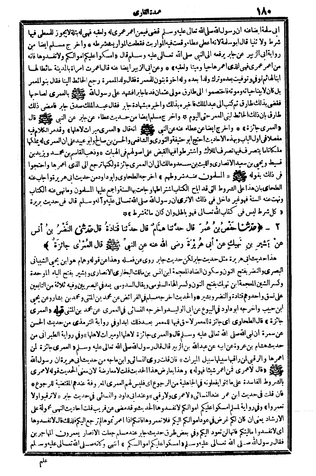 أبي سَلمَة أَيْضا عَنهُ أَن رَسُول الله، صلى الله عَلَيْهِ وَسلم، قَالَ: (أَيّمَا رجل أعمر عمرى لَهُ ولعقبه فَأَنَّهَا للَّذي أعطيها لَا ترجع إِلَى الَّذِي أَعْطَاهَا) ، لِأَنَّهُ أعْطى عَطاء وَقعت فِيهِ الْمَوَارِيث. وَعَن أبي سَلمَة عَنهُ أَيْضا. وَلَفظه، قَالَ، صلى الله عَلَيْهِ وَسلم: (أَيّمَا رجل أعمر رجلا عمرى لَهُ ولعقبه، فَقَالَ: قد أعطيتكها وَعَقِبك مَا بَقِي مِنْكُم أحد فَإِنَّهَا لمن أعطيها، وَإِنَّهَا لَا ترجع إِلَى صَاحبهَا من أجل أَنه أَعْطَاهَا عَطاء وَقعت فِيهِ الْمَوَارِيث) . وَعَن أبي سَلمَة أَيْضا عَن جَابر قَالَ: إِنَّمَا الْعُمْرَى الَّتِي أجَاز رَسُول الله، صلى الله عَلَيْهِ وَسلم أَن تَقول: هِيَ لَك ولعقبك، فَأَما إِذا قَالَ: هِيَ لَك مَا عِشْت فَإِنَّهَا ترجع إِلَى صَاحبهَا. قَالَ معمر: وَكَانَ الزُّهْرِيّ يُفْتِي بِهِ. وَعَن أبي سَلمَة أَيْضا عَنهُ: أَن رَسُول الله، صلى الله عَلَيْهِ وَسلم، قضى فِيمَن أعمر عمرى لَهُ ولعقبه فَهِيَ لَهُ بتلة لَا يجوز للمعطي فِيهَا شَرط وَلَا ثنيا، قَالَ أَبُو سَلمَة لِأَنَّهُ أعْطى عَطاء وَقعت فِيهِ الْمَوَارِيث. فَقطعت الْمَوَارِيث شَرطه. وَأخرج مُسلم أَيْضا من رِوَايَة أبي الزبير عَن جَابر يرفعهُ إِلَى النَّبِي، صلى الله عَلَيْهِ وَسلم، قَالَ: (أَمْسكُوا عَلَيْكُم أَمْوَالكُم وَلَا تفسدوها، فَإِنَّهُ من أعمر عمرى فَهِيَ للَّذي أعمرها حَيا أَو مَيتا ولعقبه) . وَعَن أبي الزبير أَيْضا عَنهُ، قَالَ: أعمرت امْرَأَة بِالْمَدِينَةِ حَائِطا لَهَا ابْنا لَهَا، ثمَّ توفّي وَتوفيت بعده، وَترك ولدا بعده، وَله إخْوَة بنُون للمعمرة، فَقَالَ ولد المعمرة: رَجَعَ الْحَائِط إِلَيْنَا، فَقَالَ بَنو المعمّر: بل كَانَ لأبينا حَيَاته وَمَوته، فاختصموا إِلَى طَارق مولى عُثْمَان فَدَعَا جَابِرا فَشهد على رَسُول الله، صلى الله عَلَيْهِ وَسلم بالعمرى لصَاحِبهَا فَقضى بذلك طَارق، ثمَّ كتب إِلَى عبد الْملك فَأخْبرهُ بذلك، وَأخْبرهُ بِشَهَادَة جَابر، فَقَالَ عبد الْملك: صدق جَابر، فَأمْضى ذَلِك طَارق بِأَن ذَلِك الْحَائِط لبني المعمَر حَتَّى الْيَوْم. وَأخرج مُسلم أَيْضا من حَدِيث عَطاء عَن جَابر عَن النَّبِي، صلى الله عَلَيْهِ وَسلم قَالَ: (الْعُمْرَى جَائِزَة) . وَأخرج أَيْضا عَن عَطاء عَنهُ عَن النَّبِي، صلى الله عَلَيْهِ وَسلم أَنه قَالَ: (المرى مِيرَاث لأَهْلهَا) وَقد مر الْكَلَام فِيهِ مفصلا فِي أول الْبَاب، وبهذه الْأَحَادِيث احْتج أَبُو حنيفَة وَالثَّوْري وَالشَّافِعِيّ وَالْحسن بن صَالح وَأَبُو عبيد، على: أَن الْعُمْرَى لَهُ يملكهَا ملكا تَاما يتَصَرَّف فِيهَا تصرف الْملاك، واشترطوا فِيهَا الْقَبْض على أصولهم فِي الهبات. وَذهب الْقَاسِم بن مُحَمَّد وَيزِيد بن قسيط وَيحيى بن سعيد الْأنْصَارِيّ وَاللَّيْث بن سعد وَمَالك إِلَى أَن الْعمريّ جَائِزَة وَلكنهَا ترجع إِلَى الَّذِي أعمرها، واحتجواغ فِي ذَلِك بقوله صلى الله عَلَيْهِ وَسلم: (الْمُسلمُونَ عِنْد شروطهم) . أخرجه الطَّحَاوِيّ وَأَبُو دَاوُد من حَدِيث أبي هُرَيْرَة. وَأجَاب عَنهُ الطَّحَاوِيّ بِأَن هَذَا على الشُّرُوط الَّتِي قد أَبَاحَ الْكتاب اشْتِرَاطهَا، وَجَاءَت بهَا السّنة، وَأجْمع عَلَيْهَا الْمُسلمُونَ، وَمَا نهى عَنهُ الْكتاب ونهت عَنهُ السّنة فَهُوَ غير دَاخل فِي ذَلِك. ألاَ تَرى أَن رَسُول الله، صلى الله عَلَيْهِ وَسلم، قَالَ فِي حَدِيث بَرِيرَة: (كل شَرط لَيْسَ فِي كتاب الله تَعَالَى فَهُوَ بَاطِل، وَإِن كَانَ مائَة شَرط) ؟ .