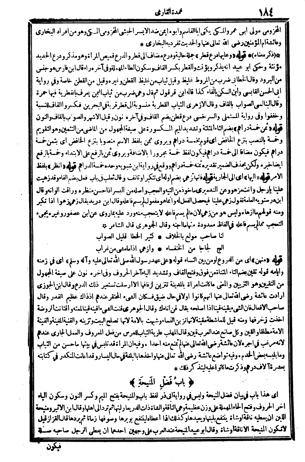 ذكر مَعْنَاهُ: قَوْله: (وَعَلَيْهَا درع قطر) ، جملَة حَالية، وَدرع، مُضَاف إِلَى: قطر، والدرع قَمِيص الْمَرْأَة، وَهُوَ مُذَكّر، وَدرع الْحَدِيد مُؤَنّثَة. وَحكى أَبُو عبيد أَنه يذكر وَيُؤَنث، والقطر، بِكَسْر الْقَاف وَسُكُون الطَّاء الْمُهْملَة وَفِي آخِره رَاء، قَالَ ابْن فَارس: هُوَ جنس من البرود. وَقَالَ الْخطابِيّ: ضرب من المروط غليظ، وَقيل: ثِيَاب من غليظ الْقطن وَغَيره، وَقيل: من الْقطن خَاصَّة، وَفِي رِوَايَة أبي الْحسن الْقَابِسِيّ وَابْن السكن بِالْفَاءِ، كَذَا قَالَه ابْن قرقول، ثمَّ قَالَ: وَهِي ضرب من ثِيَاب الْيمن يعرف بالقطرية فِيهَا حمرَة. وَقَالَ البنالسي: الصَّوَاب بِالْقَافِ، وَقَالَ الْأَزْهَرِي: الثِّيَاب القطرية منسوبة إِلَى قطر، قَرْيَة فِي الْبَحْرين، فكسروا الْقَاف للنسبة وخففوا. وَفِي رِوَايَة الْمُسْتَمْلِي والسرخسي: درع قطن، بِضَم الْقَاف وَفِي آخِره نون، وَقيل: الْأَشْهر وَالصَّوَاب بِالْقَافِ وَالنُّون. قَوْله: (ثمن خَمْسَة دَرَاهِم) ، بِضَم الثَّاء الْمُثَلَّثَة وَتَشْديد الْمِيم الْمَكْسُورَة على صِيغَة الْمَجْهُول من الْمَاضِي من التثمين، وَهُوَ التَّقْوِيم. وَخَمْسَة بِالنّصب بِنَزْع الْخَافِض أَي: قوم بِخَمْسَة دَرَاهِم، ويروى: ثمن، بِلَفْظ الإسم مَنْصُوبًا بِنَزْع الْخَافِض أَي: بِثمن خَمْسَة دَرَاهِم فَيكون مُضَافا إِلَى خَمْسَة دَرَاهِم، فَيكون لفظ خَمْسَة مجروراً بِالْإِضَافَة. ويروى: ثمن، بِالرَّفْع على الِابْتِدَاء وَخَمْسَة بِالرَّفْع أَيْضا خَبره، وَلَكِن بِحَذْف الضَّمِير تَقْدِيره: ثمنه خَمْسَة دَرَاهِم، وَوَقع فِي رِوَايَة ابْن شبويه وَحده: خمسه الدَّرَاهِم. قَوْله: (أنظر) ، بِلَفْظ الْأَمر. قَوْله: (إِلَيْهَا) أَي: إِلَى الْجَارِيَة. قَوْله: (فَإِنَّهَا تزهى) بِضَم أَوله أَي: تتكبر أَو تأنف. وَقَالَ ثَعْلَب فِي بَاب فعل، بِضَم الْفَاء، وَقد زهيت علينا يَا رجل وَأَنت مزهو، وَعند التدميري مَأْخُوذ من التيه وَالْعجب، وَأَصله من الْبُسْر إِذا حسن منظره، وراقت ألوانه، وَقَالَ ابْن درسْتوَيْه: الْعَامَّة تَقول: زهى علينا، فَيحصل الْفِعْل لَهُ، وَإِنَّمَا هُوَ مفعول لم يسم فَاعله، وَقَالَ ابْن دُرَيْد: يُقَال: زهى زهواً إِذا تكبر، وَمِنْه قَوْلهم: مَا أزهاه، وَلَيْسَ هُوَ من زهى، لِأَن مَا لم يسم فَاعله لَا يتعجب مِنْهُ، ورد عَلَيْهِ بِمَا رُوِيَ عَن ابْن عُصْفُور وَغَيره: يَجِيء التَّعَجُّب مِمَّا لم يسم فَاعله فِي أَلْفَاظ مَعْدُودَة، مِنْهَا: مَا أجنه. وَقَالَ الْجَوْهَرِي: قَالَ الشَّاعِر:
