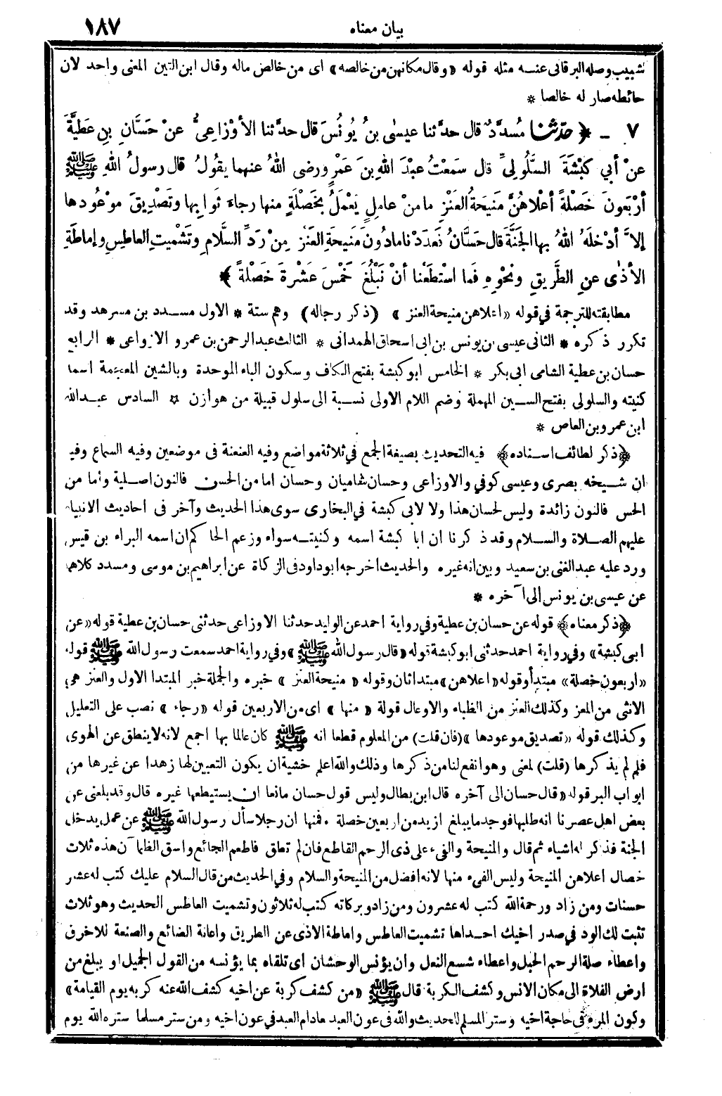 1362 - حدَّثنا مُسَدَّدٌ قَالَ حدَّثنا عيساى بنُ يُونُسَ قَالَ حدَّثنا الأوْزَاعِيُّ عنْ حَسَّانِ بنِ عَطِيَّةَ عنْ أبِي كبْشَةَ السَّلُولِيِّ قَالَ سَمِعْتُ عبْدَ الله بنَ عَمْرٍ وَرَضي الله تَعَالَى عَنْهُمَا يقُولُ قَالَ رسولُ الله صلى الله عَلَيْهِ وَسلم أربَعُونَ خَصْلَةً أعْلاهُنَّ مَنيحَةُ العَنْزِ مَا منْ عامِلٍ يَعْمَلُ بِخَصْلَةٍ مِنْهَا رجاءَ ثَوابِها وتَصْدِيقَ مَوْعُودِها إلاَّ أدْخَلَهُ الله بهَا الجَنَّةَ قَالَ حَسَّانُ فَعَدَدْنَا مَا دُونَ مَنِيحَةِ العَنْزِ مِنْ رَدِّ السَّلاَمِ وتَشْمِيتِ العاطِسِ وإمَاطَةِ الأذاى عنِ الطَّرِيقِ ونَحُوِهِ فَما اسْتَطَعْنَا أنْ نَبْلُغَ خَمْسَ عَشْرَةَ خَصْلَةً.