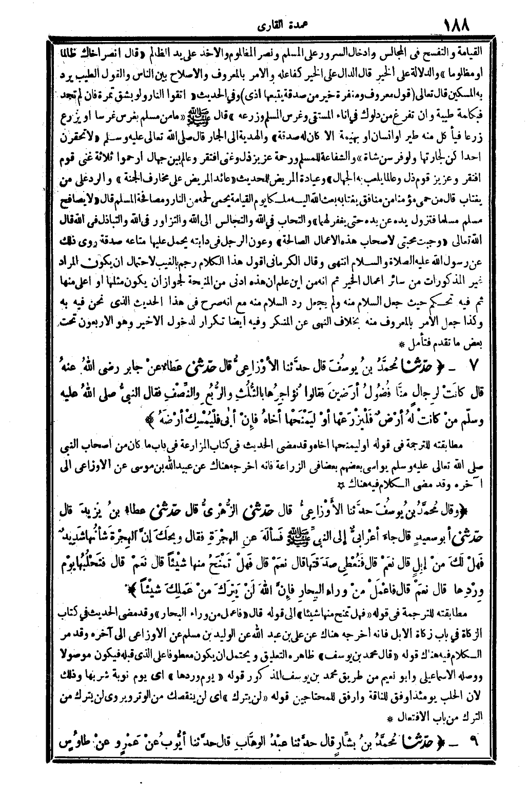 مطابقته للتَّرْجَمَة فِي قَوْله: (فَهَل تمنح مِنْهَا شَيْئا) ءلى قَوْله. قَالَ: (فاعمل من وَرَاء الْبحار) ، وَقد مضى الحَدِيث فِي كتاب الزَّكَاة فِي: بَاب زَكَاة الْإِبِل، فَإِنَّهُ أخرجه هُنَاكَ عَن عَليّ بن عبد الله عَن الْوَلِيد بن مُسلم عَن الْأَوْزَاعِيّ إِلَى آخِره، وَقد مر الْكَلَام فِيهِ هُنَاكَ. قَوْله: (قَالَ مُحَمَّد بن يُوسُف) ، ظَاهره التَّعْلِيق، وَيحْتَمل أَن يكون مَعْطُوفًا على الَّذِي قبله، فَيكون مَوْصُولا وَوَصله الْإِسْمَاعِيلِيّ وَأَبُو نعيم من طَرِيق مُحَمَّد بن يُوسُف الْمَذْكُور. قَوْله: (يَوْم وردهَا) ، أَي: يَوْم نوبَة شربهَا، وَذَلِكَ لِأَن الْحَلب يَوْمئِذٍ أوفق للناقة وأرفق للمحتاجين. قَوْله: (لن يتْرك) ، أَي: لن ينْقصك من الْوتر، ويروى: لن يتْرك من التّرْك، من بَاب الافتعال.
