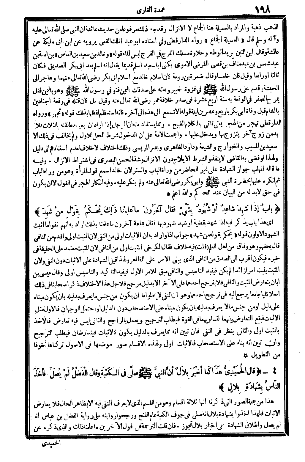 وَقَالَ الحُمَيْدِيُّ هَذَا كَما أخْبَرَ بِلالٌ أنَّ النَّبِيَّ صلى الله عَلَيْهِ وَسلم صلَّى فِي الكَعْبَةِ وَقَالَ الْفَضْلُ لَمْ يُصَلِّ فأخَذَ النَّاسُ بِشَهَادَةِ بِلالٍ