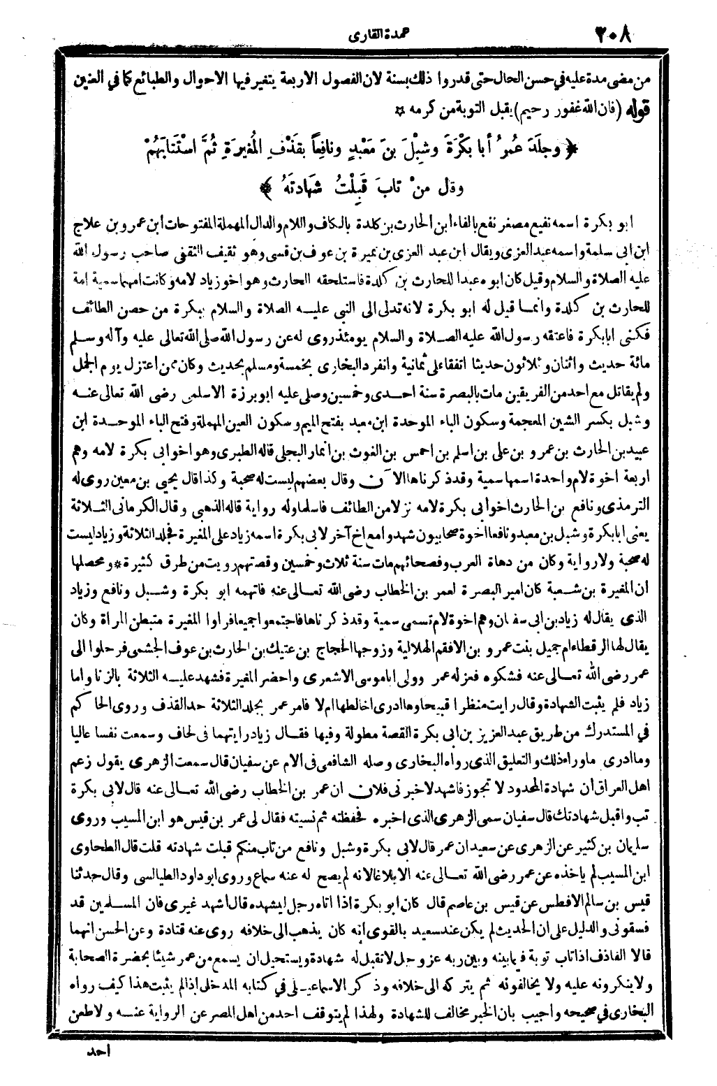 أَبُو بكرَة اسْمه نفيع مصغر نفع بِالْفَاءِ: ابْن الْحَارِث بن كلدة، بِالْكَاف وَاللَّام وَالدَّال الْمُهْملَة المفتوحات: ابْن عَمْرو بن علاج ابْن أبي سَلمَة واسْمه: عبد الْعُزَّى، وَيُقَال: ابْن عبد الْعزي بن نميرة بن عَوْف بن قسي، وَهُوَ ثَقِيف الثَّقَفِيّ، صَاحب رَسُول الله، صلى الله عَلَيْهِ وَسلم، وَقيل: كَانَ أَبوهُ عبدا لِلْحَارِثِ بن كلدة، فاستلحقه الْحَار وَهُوَ أَخُو زِيَاد لأمه، وَكَانَت أمهما سميَّة أمة لِلْحَارِثِ بن كلدة، وَإِنَّمَا قيل لَهُ: أَبُو بكرَة، لِأَنَّهُ تدلى إِلَى النَّبِي، صلى الله عَلَيْهِ وَسلم، ببكرة من حصن الطَّائِف، فكنى أَبَا بكرَة فَأعْتقهُ رَسُول الله، صلى الله عَلَيْهِ وَسلم، يَوْمئِذٍ رُوِيَ لَهُ عَن رَسُول الله، صلى الله عَلَيْهِ وَسلم، مائَة حَدِيث وَاثْنَانِ وَثَلَاثُونَ حَدِيثا، اتفقَا على ثَمَانِيَة، وَانْفَرَدَ البُخَارِيّ بِخَمْسَة، وَمُسلم بِحَدِيث، وَكَانَ مِمَّن اعتزل يَوْم الْجمل وَلم يُقَاتل مَعَ أحد من الْفَرِيقَيْنِ، مَاتَ بِالْبَصْرَةِ سنة إِحْدَى وَخمسين، وَصلى عَلَيْهِ أَبُو بَرزَة الْأَسْلَمِيّ، رَضِي الله تَعَالَى عَنهُ، وشبل، بِكَسْر الشين الْمُعْجَمَة وَسُكُون الْبَاء الْمُوَحدَة: ابْن معبد، بِفَتْح الْمِيم وَسُكُون الْعين الْمُهْملَة وَفتح الْبَاء الْمُوَحدَة: ابْن عبيد بن الْحَارِث بن عَمْرو بن عَليّ بن أسلم بن أحمس بن الْغَوْث بن أَنْمَار البَجلِيّ، قَالَه الطَّبَرِيّ، وَهُوَ أَخُو أبي بكرَة لأمه، وهم أَرْبَعَة أخوة لأم وَاحِدَة اسْمهَا سميَّة. وَقد ذَكرنَاهَا الْآن. وَقَالَ بَعضهم: لَيست لَهُ صُحْبَة، وَكَذَا قَالَ يحيى بن معِين، روى لَهُ التِّرْمِذِيّ، وَنَافِع بن الْحَارِث أَخُو أبي بكرَة لأمه نزلا من الطَّائِف فَأَسْلمَا وَله رِوَايَة، قَالَه الذَّهَبِيّ. وَقَالَ الْكرْمَانِي: الثَّلَاثَة يَعْنِي: أَبَا بكرَة وشبل بن معبد ونافعاً أخوة صحابيون شهدُوا مَعَ أَخ آخر لأبي بكرَة اسْمه: زِيَاد، على الْمُغيرَة فجلد الثَّلَاثَة، وَزِيَاد لَيست لَهُ صُحْبَة وَلَا رِوَايَة، وَكَانَ من دهاة الْعَرَب وفصحائهم، مَاتَ سنة ثَلَاث وَخمسين، وقصتهم رويت من طرق كَثِيرَة. ومحصلها: أَن الْمُغيرَة بن شُعْبَة كَانَ أَمِير الْبَصْرَة لعمر بن الْخطاب، رَضِي الله تَعَالَى عَنهُ، فاتهمه أَبُو بكرَة وشبل وَنَافِع وَزِيَاد الَّذِي يُقَال لَهُ زِيَاد بن أبي سُفْيَان، وهم أخوة لأم تسمى: سميَّة، وَقد ذَكرنَاهَا، فَاجْتمعُوا جَمِيعًا فَرَأَوْا الْمُغيرَة متبطن الْمَرْأَة، وَكَانَ يُقَال لَهَا: الرقطاء أم جميل بنت عَمْرو بن الأفقم الْهِلَالِيَّة، وَزوجهَا الْحجَّاج بن عتِيك بن الْحَارِث بن عَوْف الْجُشَمِي، فرحلوا إِلَى عمر، رَضِي الله تَعَالَى عَنهُ، فشكوه، فَعَزله عمر وَولى أَبَا مُوسَى الْأَشْعَرِيّ، وأحضر الْمُغيرَة فَشهد عَلَيْهِ الثَّلَاثَة بِالزِّنَا، وَأما زِيَاد فَلم يثبت الشَّهَادَة، وَقَالَ: رَأَيْت منْظرًا قبيحاً وَمَا أَدْرِي أخالطها أم لَا؟ فَأمر عمر بجلد الثَّلَاثَة حد الْقَذْف، وروى الْحَاكِم فِي (الْمُسْتَدْرك) من طَرِيق عبد الْعَزِيز بن أبي بكرَة الْقِصَّة مُطَوَّلَة، وفيهَا: فَقَالَ زِيَاد: رأيتهما فِي لِحَاف وَسمعت نفسا عَالِيا، وَمَا أَدْرِي مَا وَرَاء ذَلِك، وَالتَّعْلِيق الَّذِي رَوَاهُ البُخَارِيّ وَصله الشَّافِعِي فِي (الْأُم) عَن سُفْيَان، قَالَ: سَمِعت الزُّهْرِيّ يَقُول: زعم أهل الْعرَاق أَن شَهَادَة الْمَحْدُود لَا تجوز، فَأشْهد لأخبرني فلَان أَن عمر بن الْخطاب، رَضِي الله تَعَالَى عَنهُ، قَالَ لأبي بكرَة، تب وَأَقْبل شهادتك. قَالَ سُفْيَان: سمى الزُّهْرِيّ الَّذِي أخبرهُ فحفظته ثمَّ نَسِيته، فَقَالَ لي عمر بن قيس: هُوَ ابْن الْمسيب، وروى سُلَيْمَان بن كثير عَن الزُّهْرِيّ عَن سعيد أَن عمر قَالَ لأبي بكرَة وشبل وَنَافِع: من تَابَ مِ